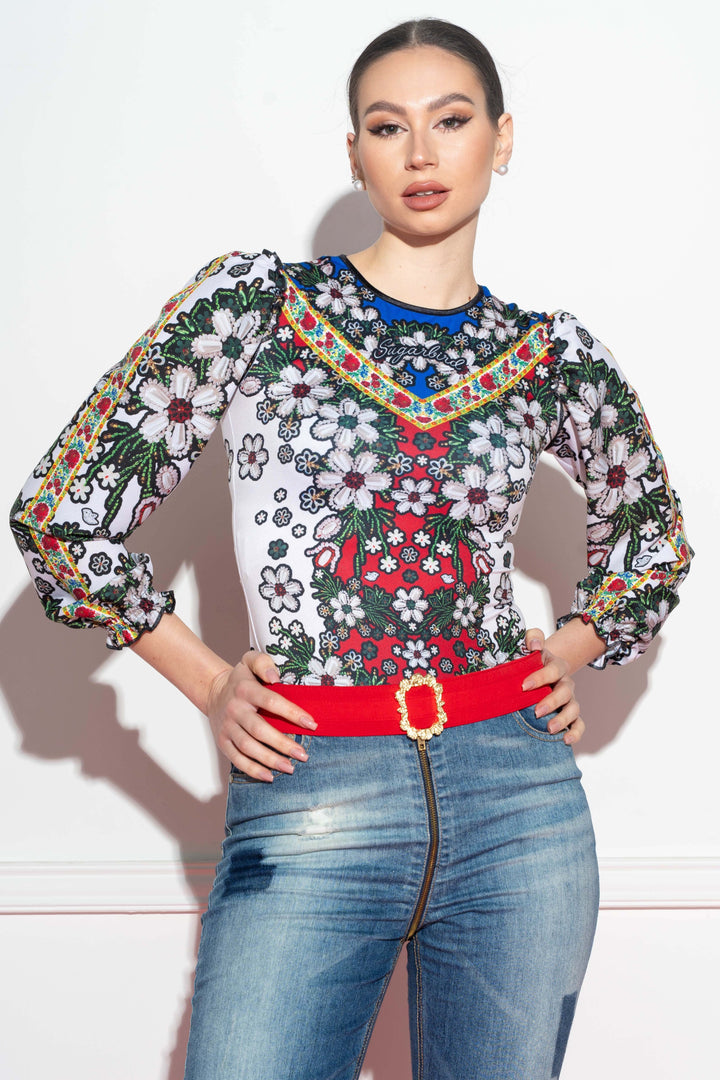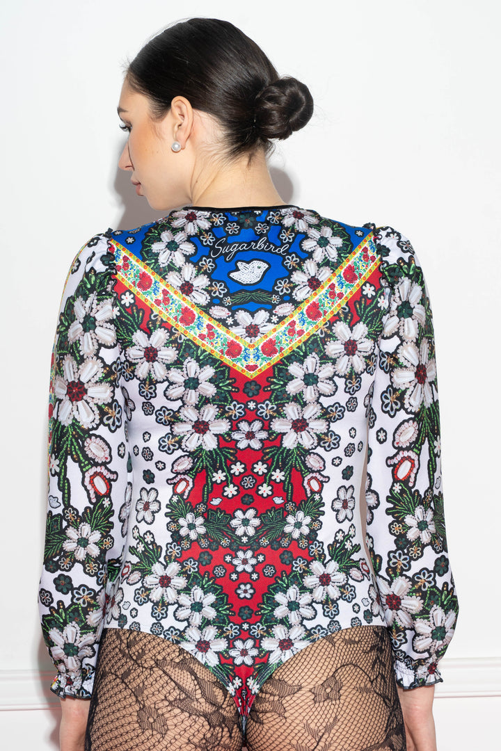 Hosszú és enyhén puffos ujjú, alak követő body. Alul gumizott combrésszel, ülepén állítható kapoccsal záródik. Ujja alja gumizott, zárt és kerek kivágású nyaka keskeny pánttal szegett. Vállait keskeny, húzott fodor díszíti. A fazonra SUGARBIRD feliratú címkét varrtunk.