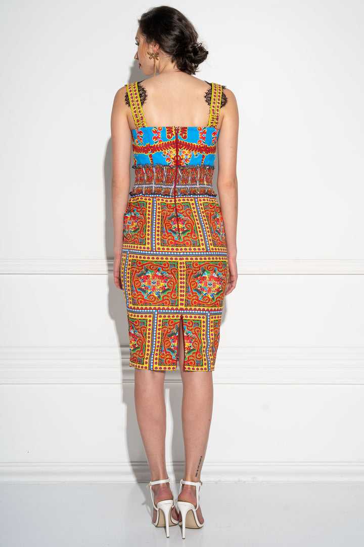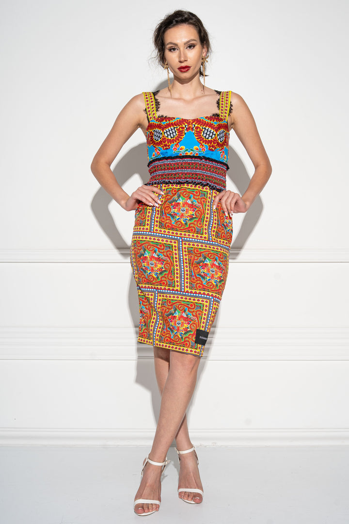 Széles, gumizott vállpántos, alak követő, térd alá érő, bélelt ruha. Háta közepén zipzárral nyílik. Alján a lépéshasíték rejtett zipzárral állítható méretű. Széles derékpántja több soron gumicérnával húzott. Bal elejére SUGARBIRD címkét varrtunk.