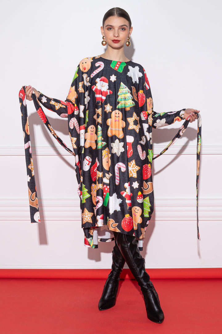 Hosszú ujjú, térdig érő, extra laza és bő fazonú tunika. Zárt kivágású nyaka keskeny pánttal szegett. Hosszú kötőjével derékra szűkíthető. Bal ujjára SUGARBIRD feliratú címkét varrtunk.