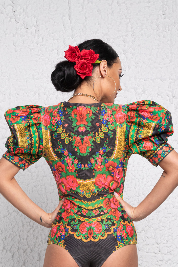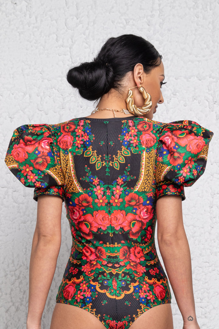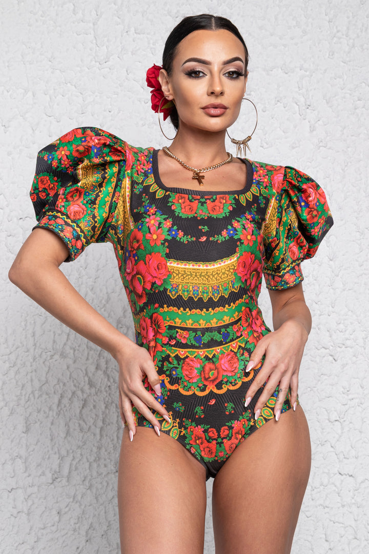 Rövid és puffos ujjú, alak követő body. Mélyen dekoltált nyaka keskeny pánttal, ujja alja félbehajtott pánttal szegett. Alján gumizott combrésszel és állítható akasztós kapoccsal záródik. Ujjára SUGARBIRD feliratú címkét varrtunk.
