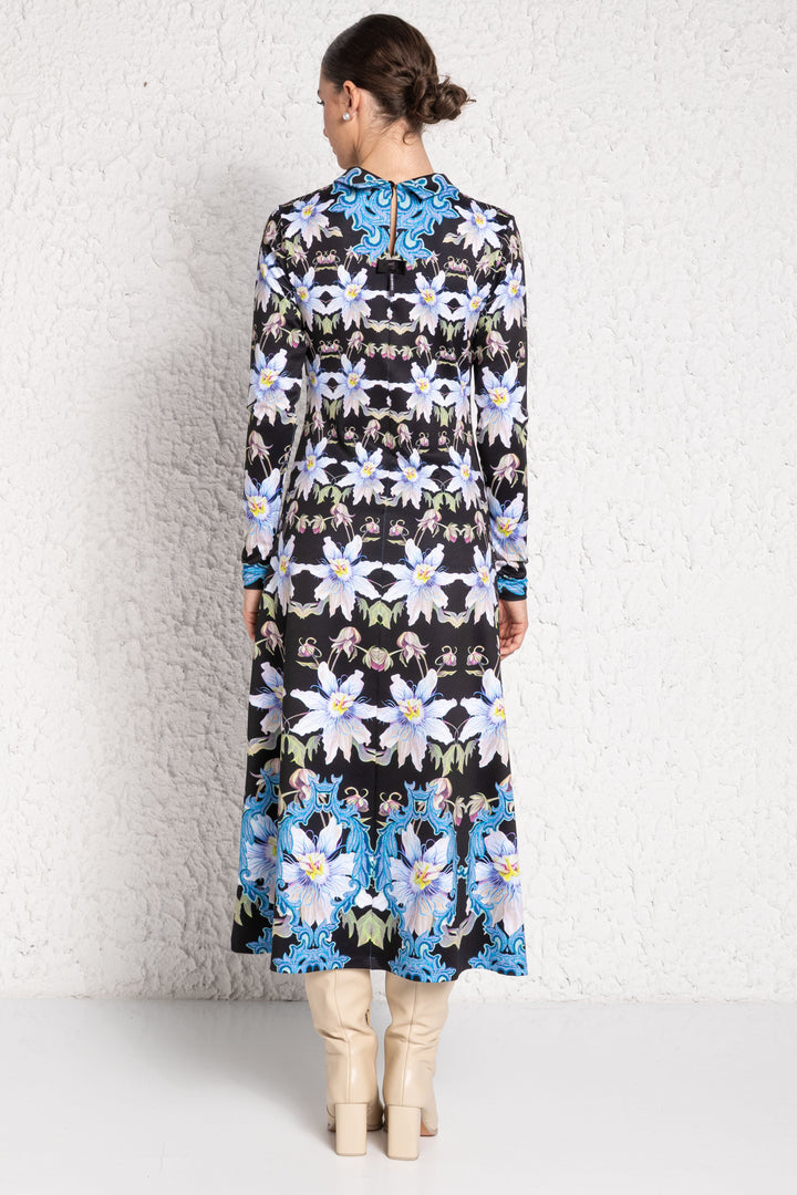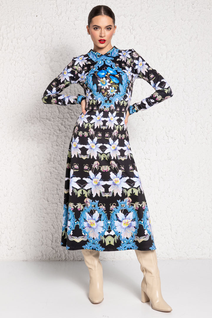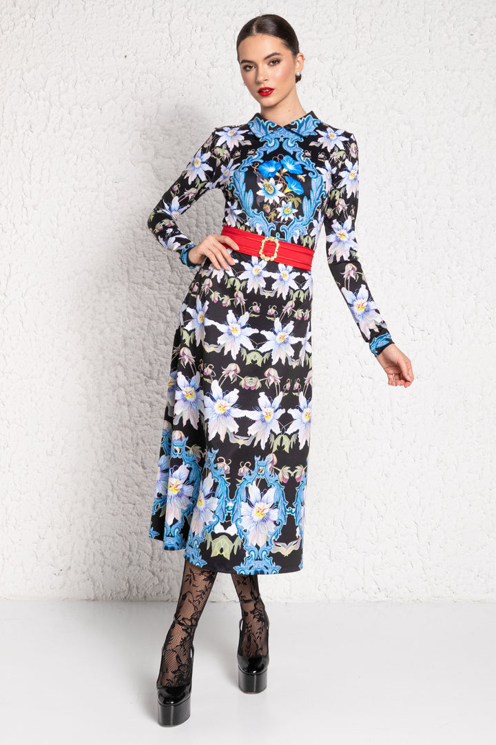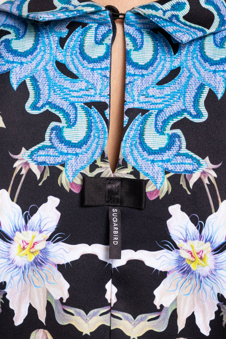 Hosszú ujjú, vádliközép hosszúságú, alak követő ruha. Szoknya része bővülő „A” vonalú. Nyakát gallér szegi, hátán egy hasíték felett gombbal záródik. A hasíték alatt SUGARBIRD feliratú címke és masnis kellék díszíti.