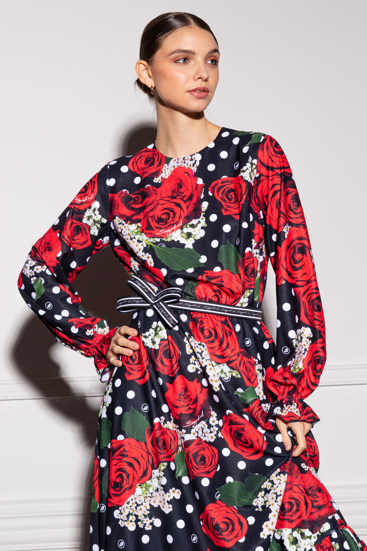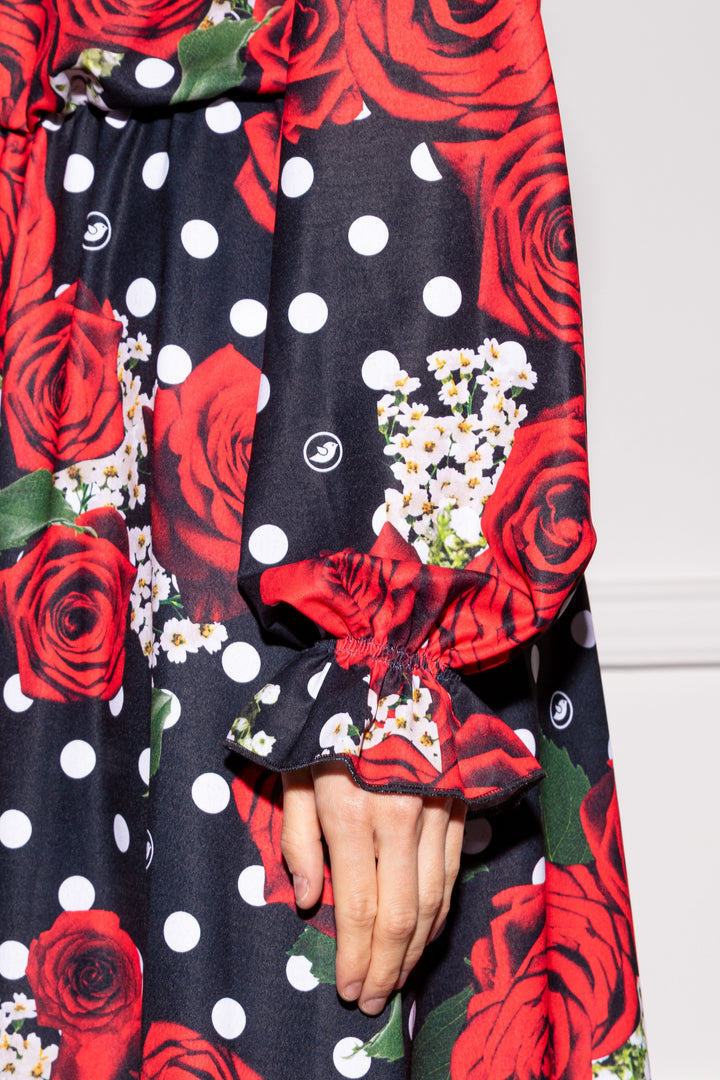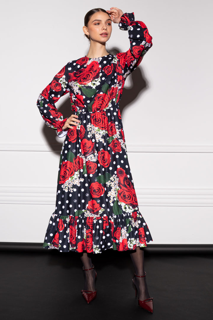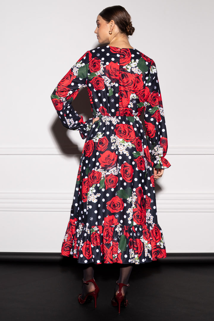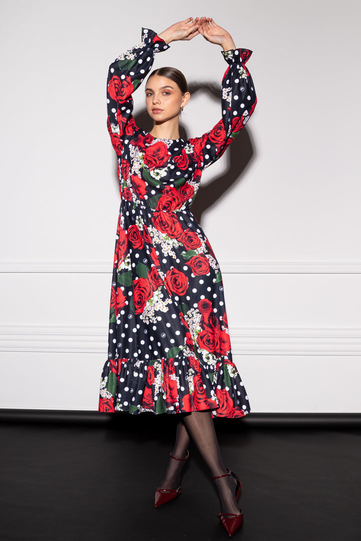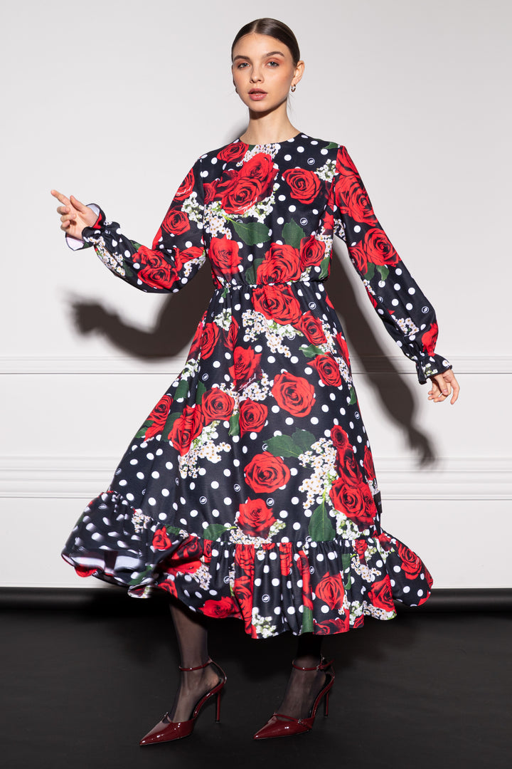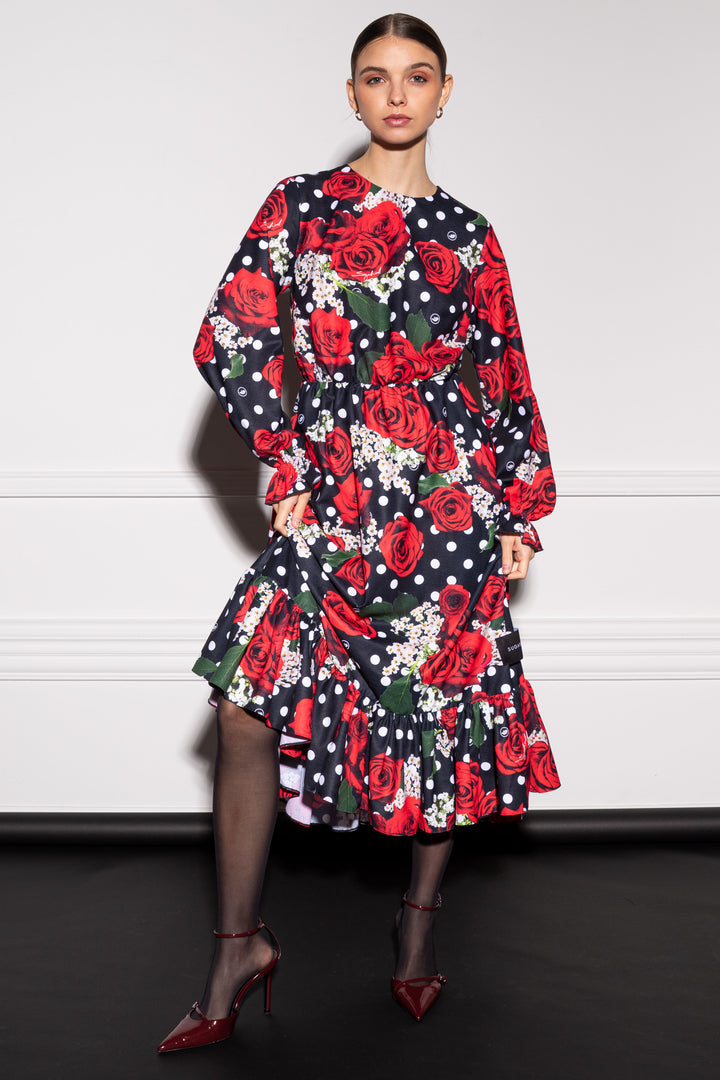 Vádliközép hosszúságú, hosszú ujjú, laza fazonú ruha. Alját széles és húzott fodor szegi, dereka és az ujja csuklónál gumizott. Háta közepén zipzárral nyitható. Elejére SUGARBIRD feliratú címkét varrtunk.