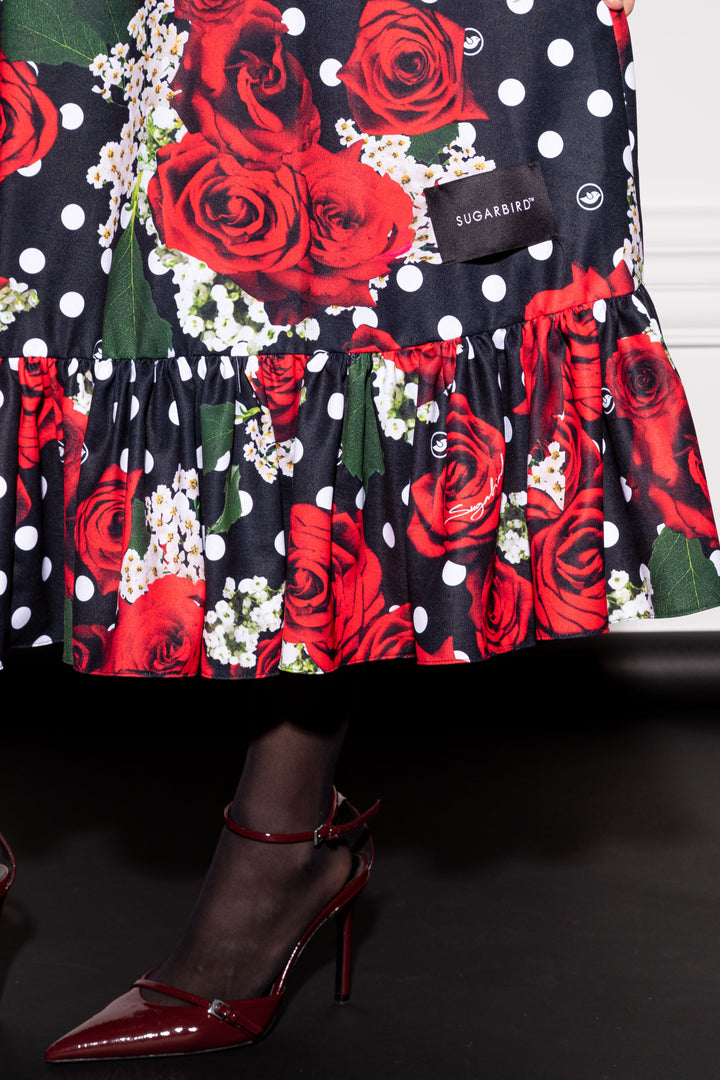 Válogass elegáns fazonjainkból, melyeket fekete és pöttyös alapra printelt rózsa és levél motívumok teszik különlegessé.