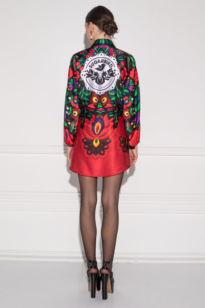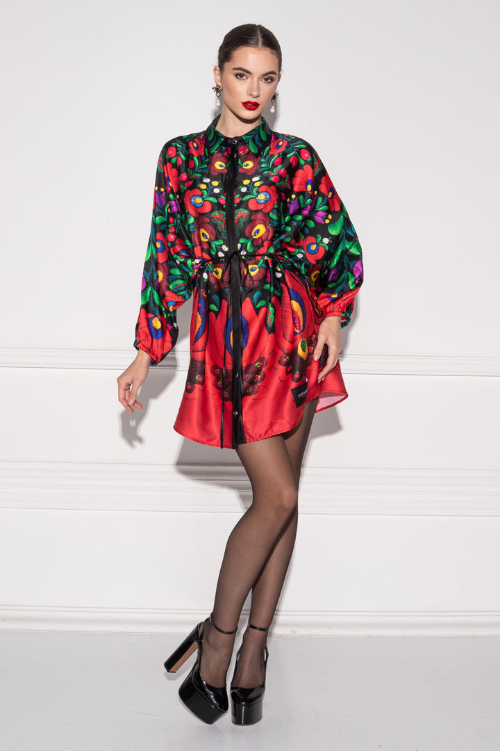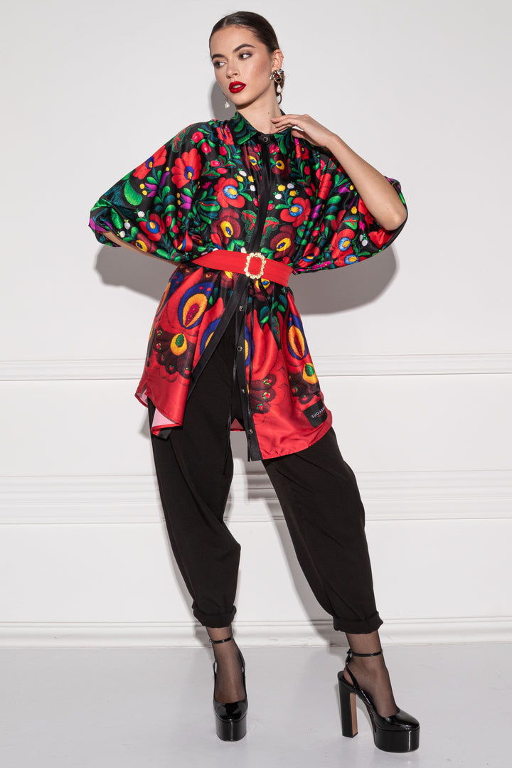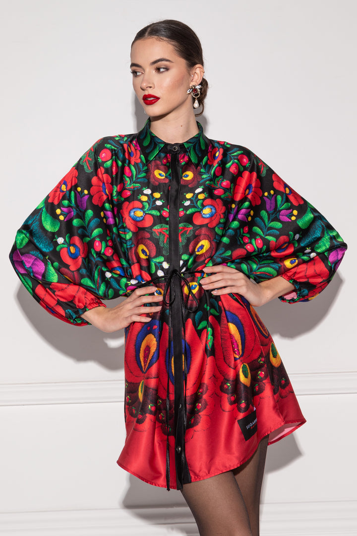 Tunika hosszúságú, hosszú ujjú, laza fazonú felső. Nyakát szabott gallér szegi, elején gombokkal záródik. Derék vonalában hajtások formázzák, keskeny, végzárókkal ellátott kötőjével derékra szűkíthető. Ujja alja gumizott, alján az oldalvarrásokban hasíték fut. Elejére SUGARBIRD MATYÓ feliratú címkét varrtunk.