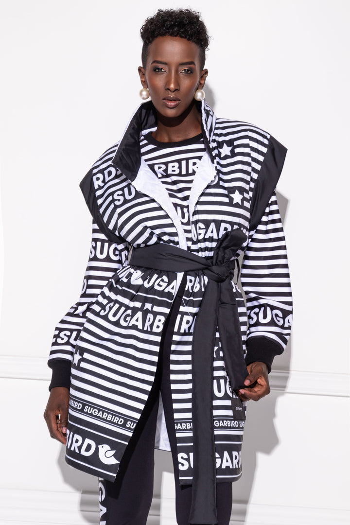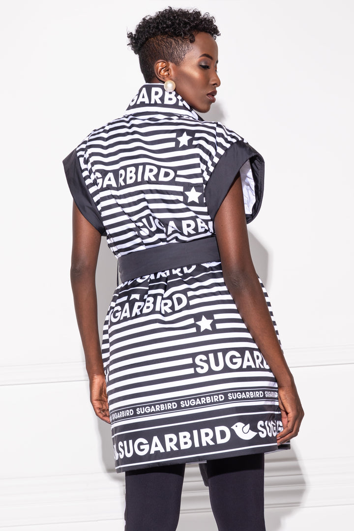 Álló gallérú, combközépig érő, egyenes fazonú, bélelt pufi mellény. Oldalain zsebek találhatók. A mellény kiegészítője egy hosszú és széles öv, mellyel derékra köthető. Elejére SUGARBIRD feliratú címkét varrtunk.