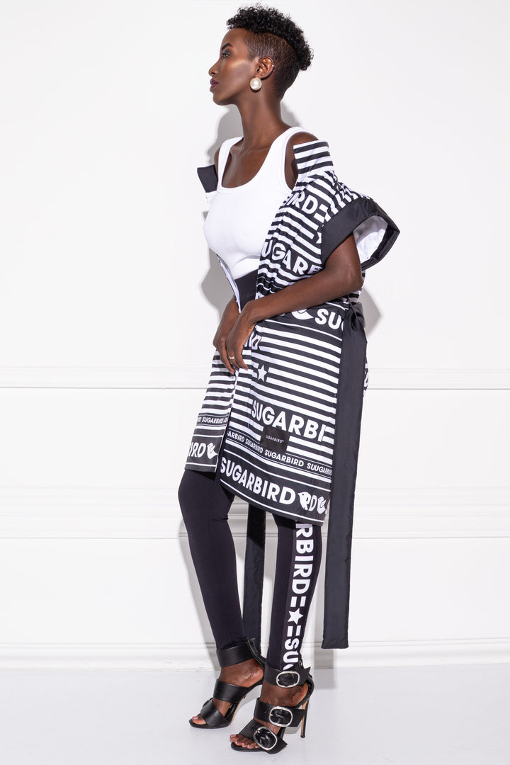 Kedvelt fazonunkat fekete és fehér SUGARBIRD feliratok Sugi madarak printelt mintája díszíti.