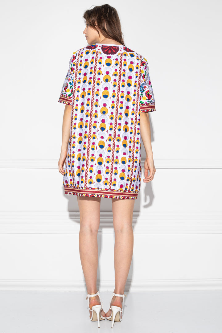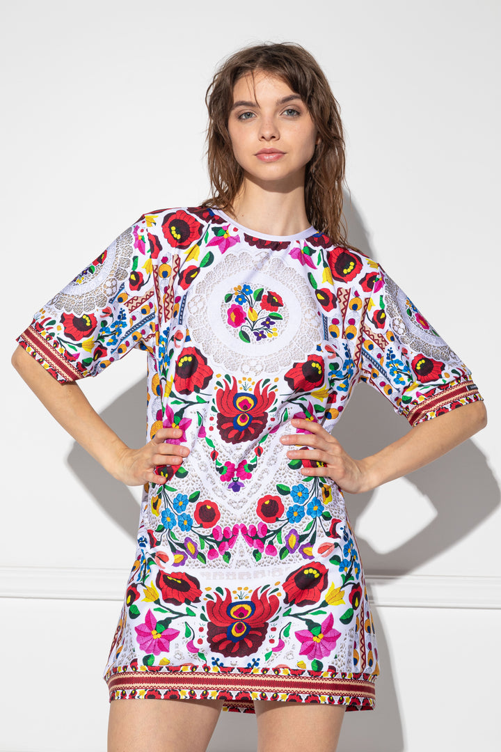 Rövid ujjú, bő, laza fazonú, combközépig érő tunika. Zárt kerek nyakát keskeny pánt szegi. A fazonra SUGARBIRD feliratú címkét varrtunk.