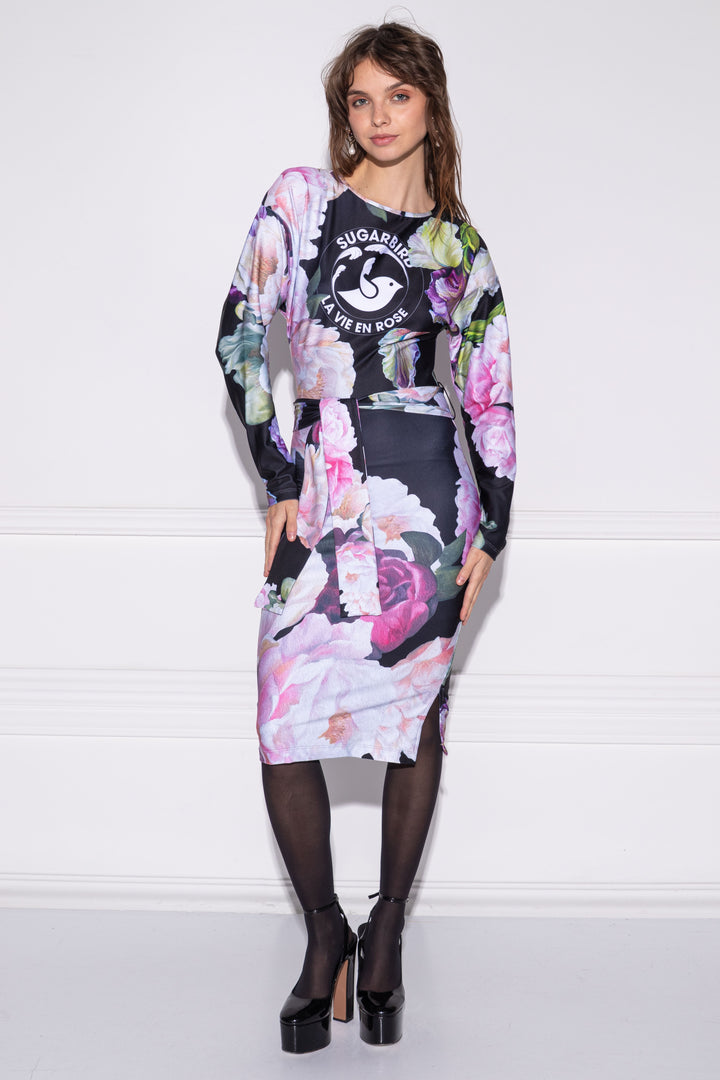 Térd alá érő, hosszú ujjú, ejtett vállú, alak követő ruha. Nyakát félbehajtott pánt szegi. Jobb alja oldalában lépéshasítékot, derekára övtartókat helyeztünk, melyben egy hosszú kötős övvel derékra szűkíthető a fazon. Hátára SUGARBIRD feliratú címkét varrtunk.