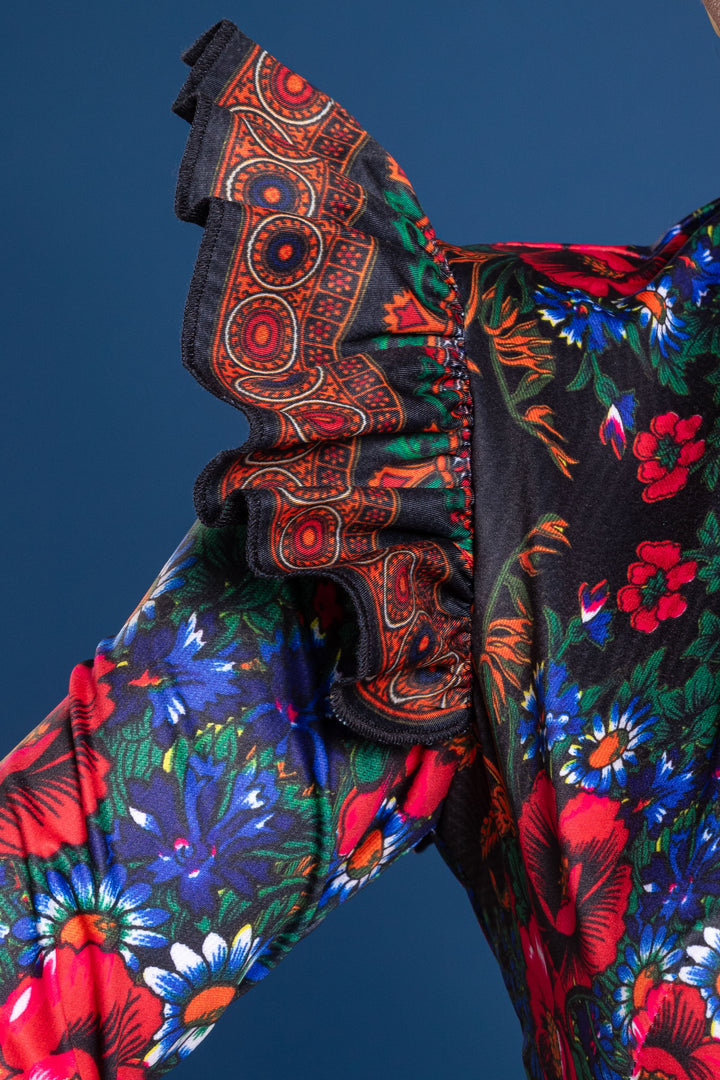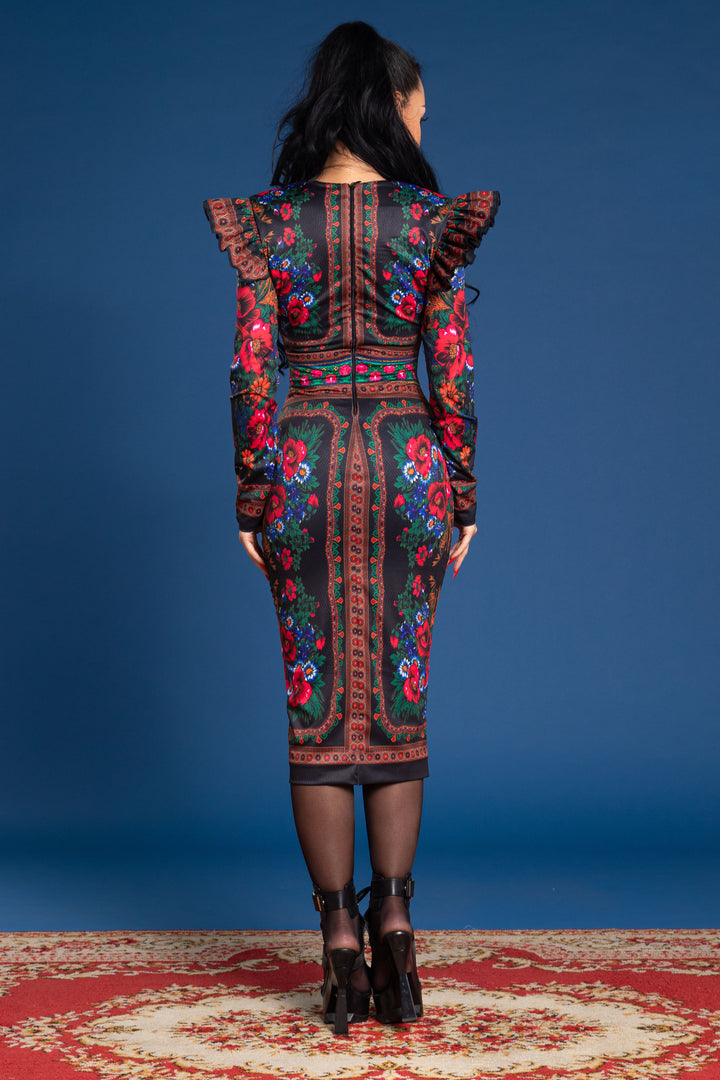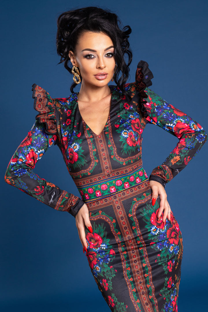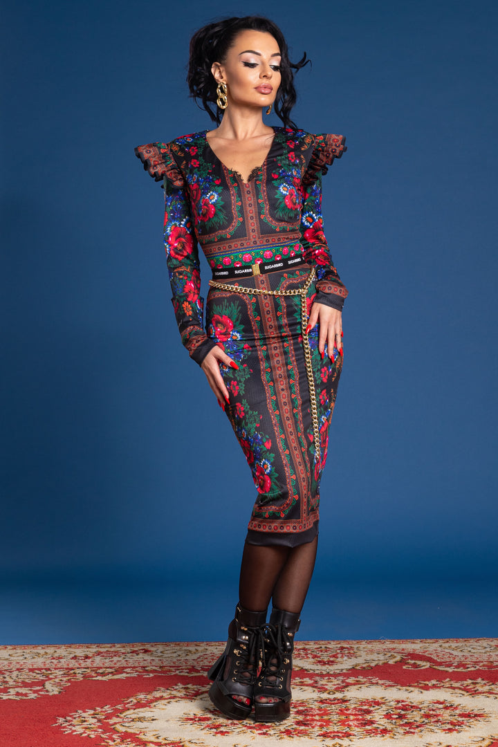 Vádliközép hosszúságú, alak követő, hosszú ujjú, bélelt ruha. Nyaka „V” alakban kivágott, vállait húzott fodor díszíti. Háta közepén zipzárral nyitható. Ujjára SUGARBIRD feliratú címkét varrtunk.