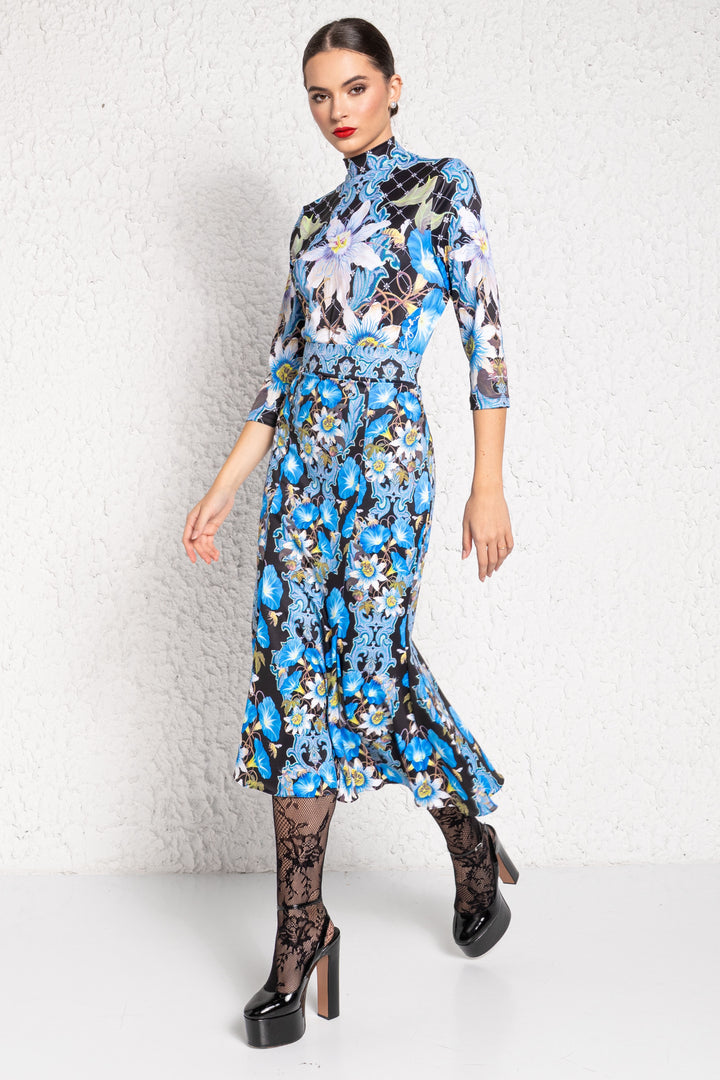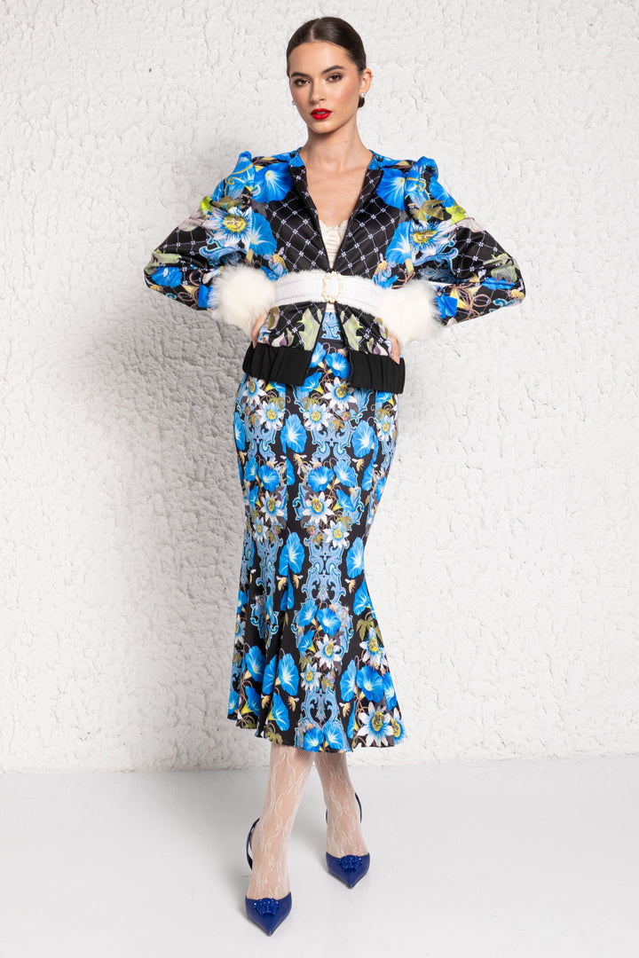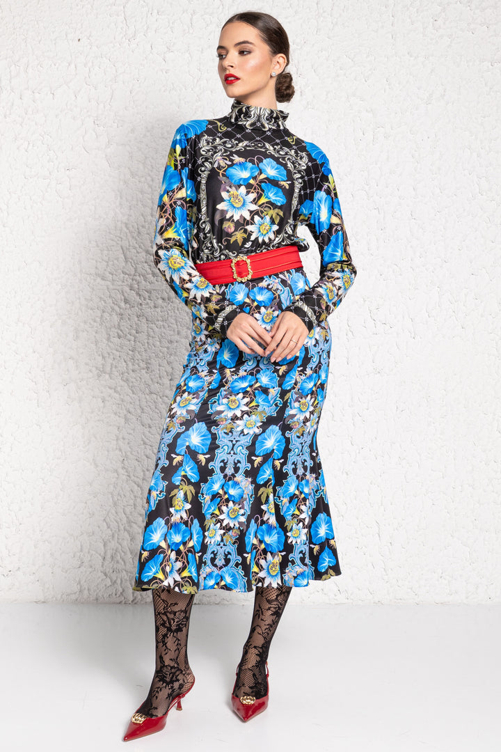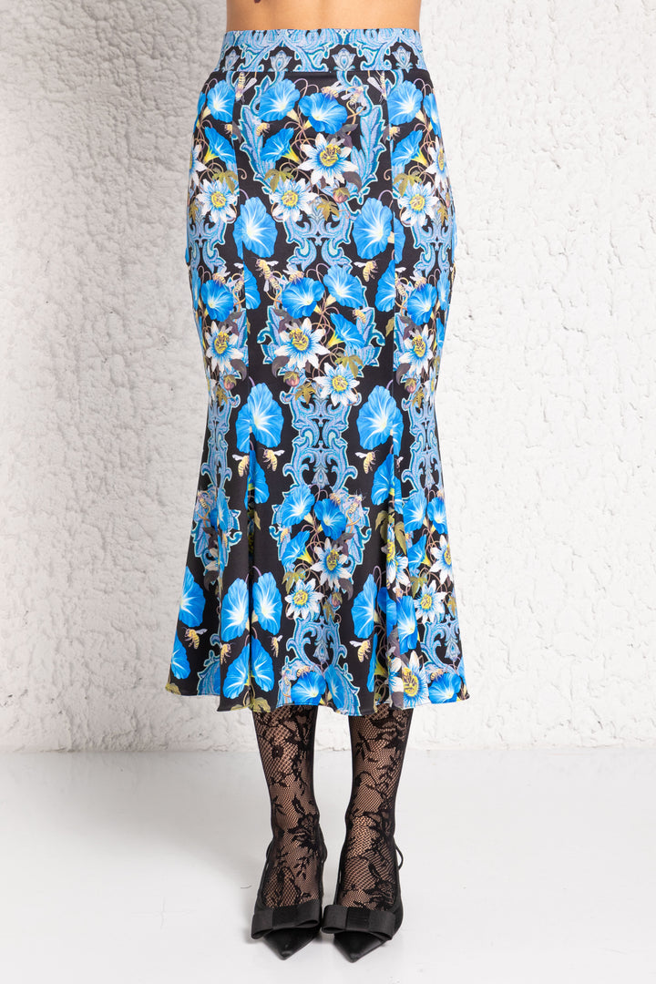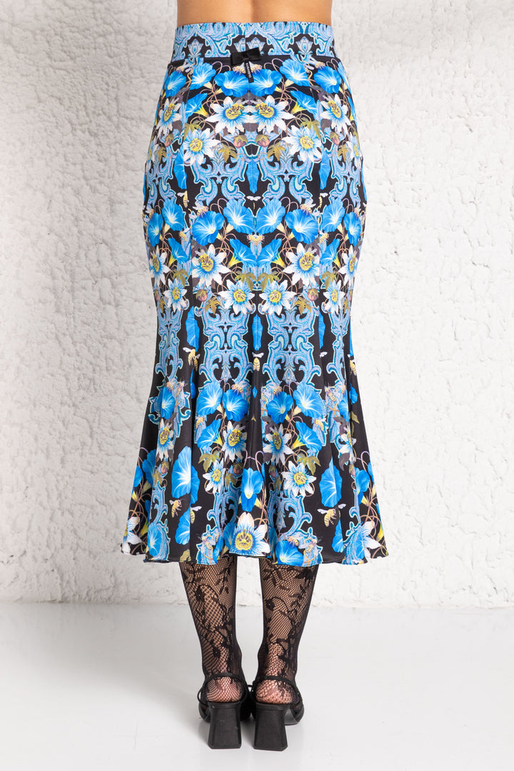 Vádliközép hosszúságú, alak követő szoknya. Derekát félbehajtott pánt szegi, alja enyhén bővülő. Hátán SUGARBIRD feliratú címke és masnis kellék díszíti.