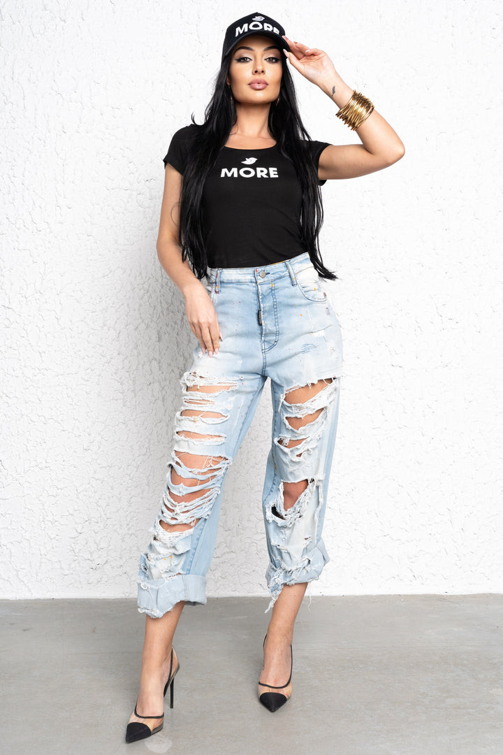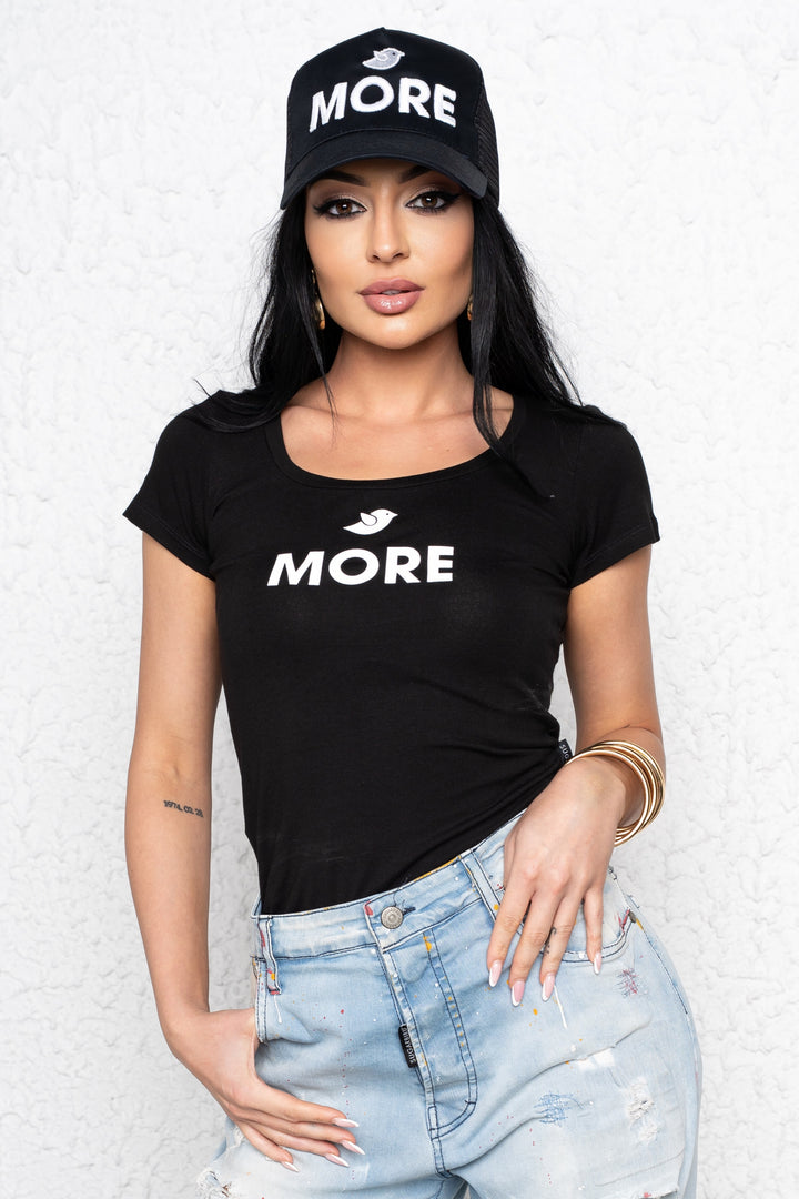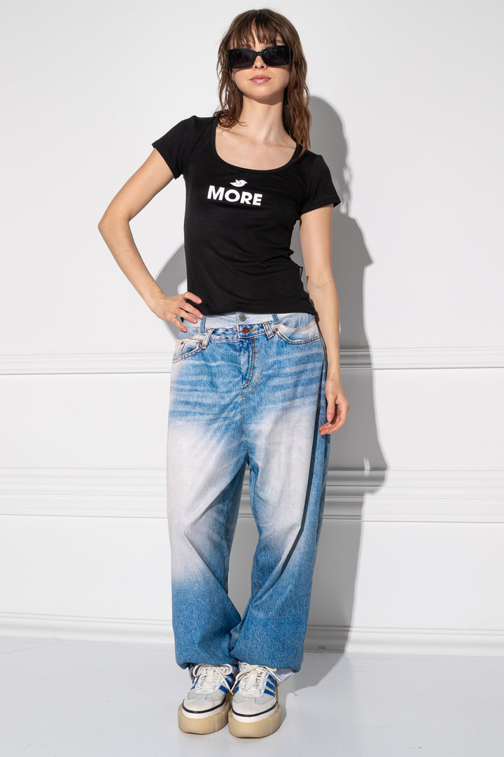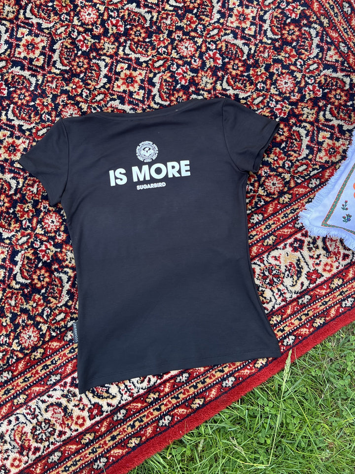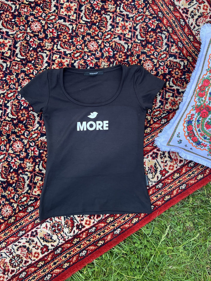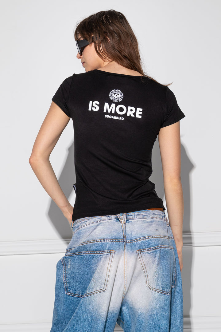 Rövid ujjú, csípőig érő, alak követő felső. Mélyen és ívesen kivágott nyaka szabott, félbehajtott pánttal van eldolgozva. Oldalában SUGARBIRD feliratú címke díszíti.