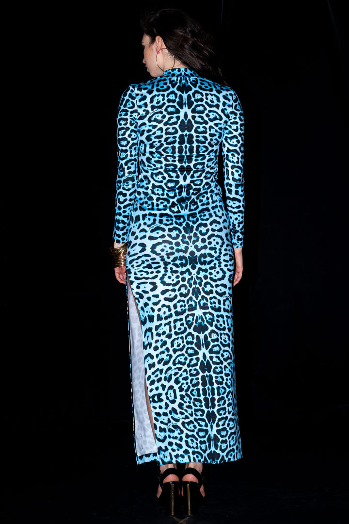 Maxi hosszúságú, hosszú ujjú, alak követő ruha. Nyakát széles garbós pánt szegi, bal oldalán magasan húzódó hasíték található. Elején SUGARBIRD feliratú címke díszíti.