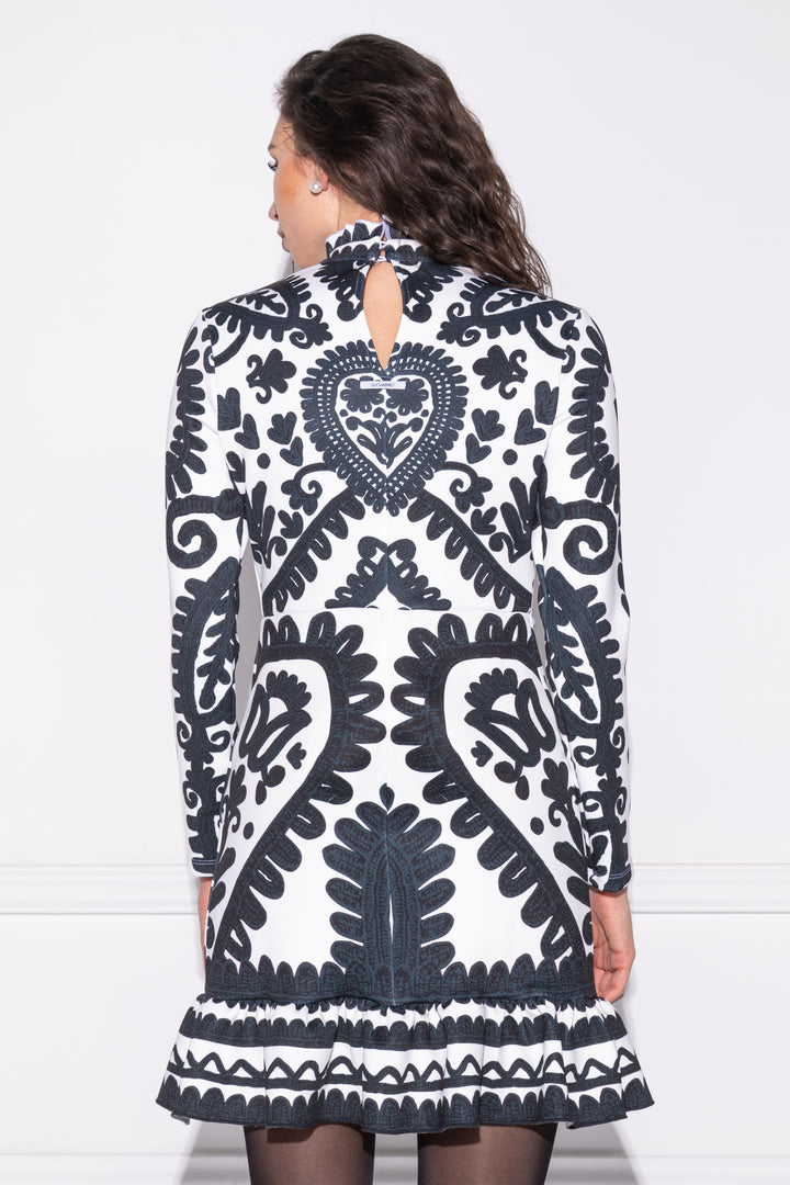 Hosszú ujjú, combközép hosszúságú, alak követő ruha. Nyakát álló gallér szegi, mely a hátán egy hasíték felett gombokkal záródik. Gallérján keskeny, az alján széles, húzott fodor díszíti. A hátára SUGARBIRD feliratú címkét varrtunk.