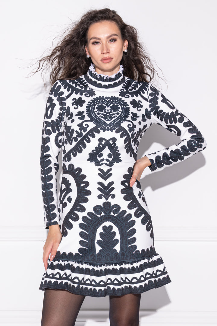 Kollekciónk mintája az Erdélyben található kalotaszegi írottas hímzés alapján készült, darabjait fekete alapra fehér színnel printelt grafikák díszítik.