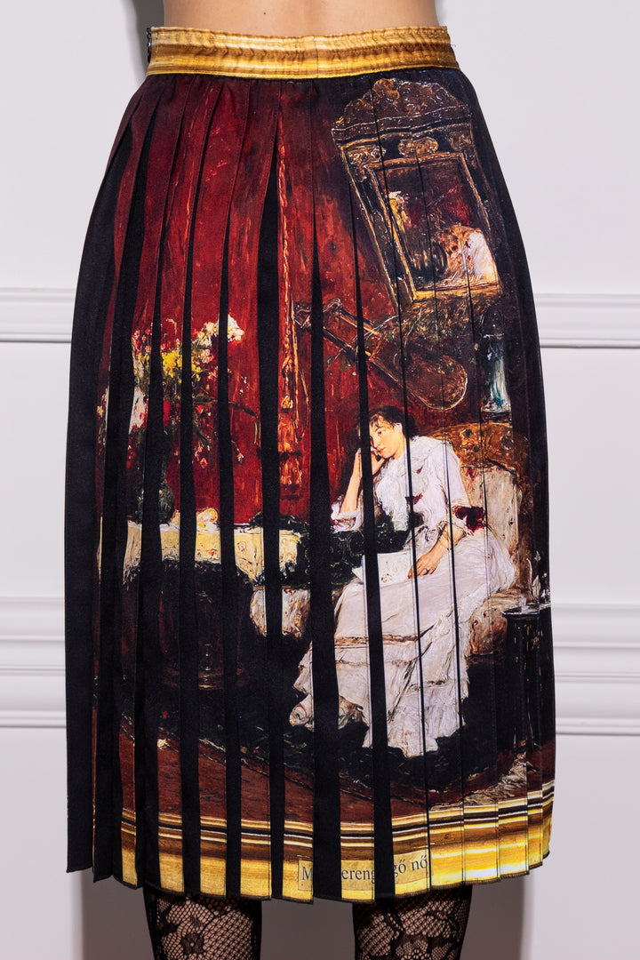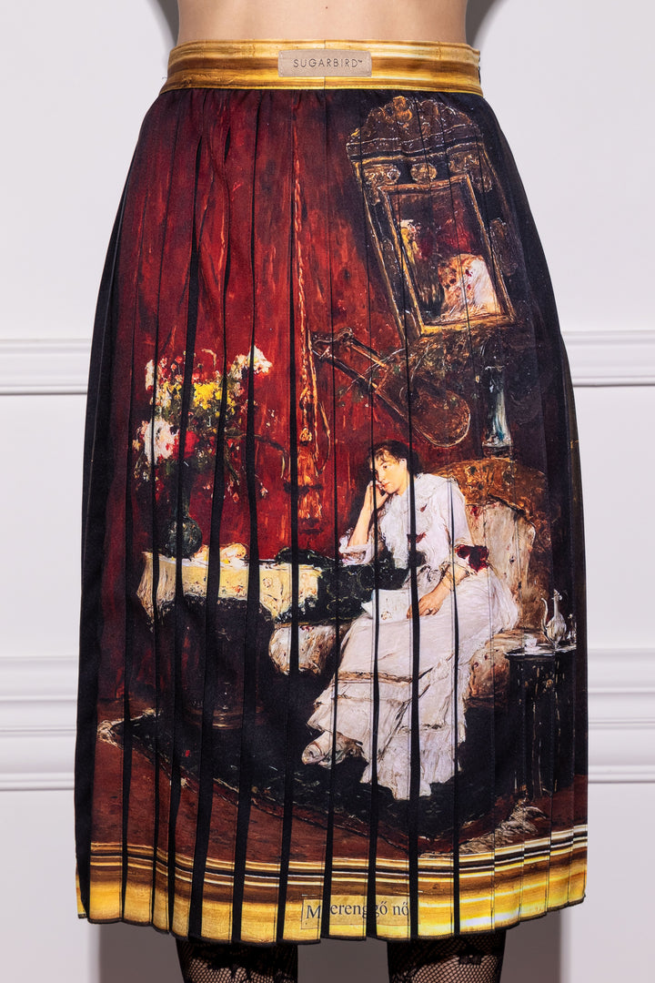 Térd alatti hosszúságú, bő fazonú szoknya. Oldalán zipzárral nyitható. Derekát félbehajtott pánt szegi, a szoknyát körben apró tűzött hajtások formázzák. Elején SUGARBIRD feliratú címke díszíti.