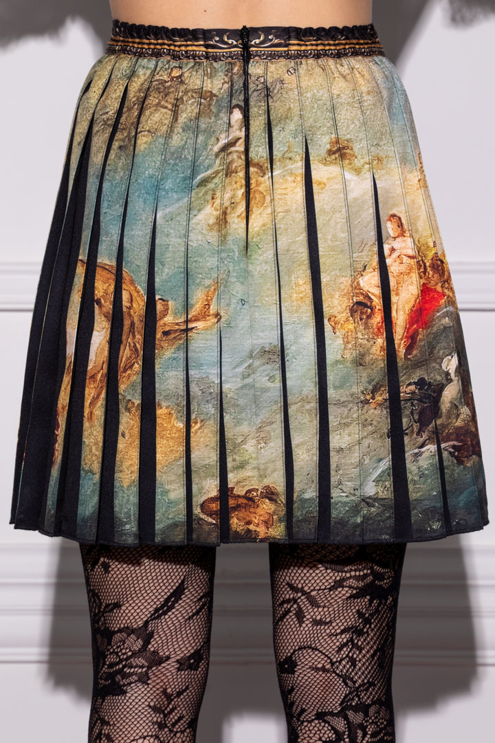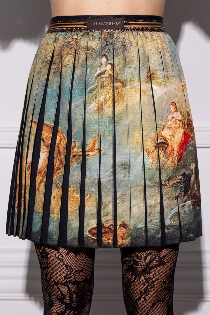 Combközép hosszúságú, bő fazonú szoknya. Háta közepén zipzárral nyitható. Derekát félbehajtott pánt szegi, a szoknyát körben apró tűzött hajtások formázzák. Elején SUGARBIRD feliratú címke díszíti.
