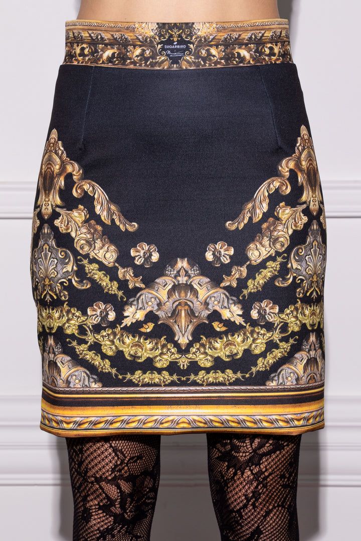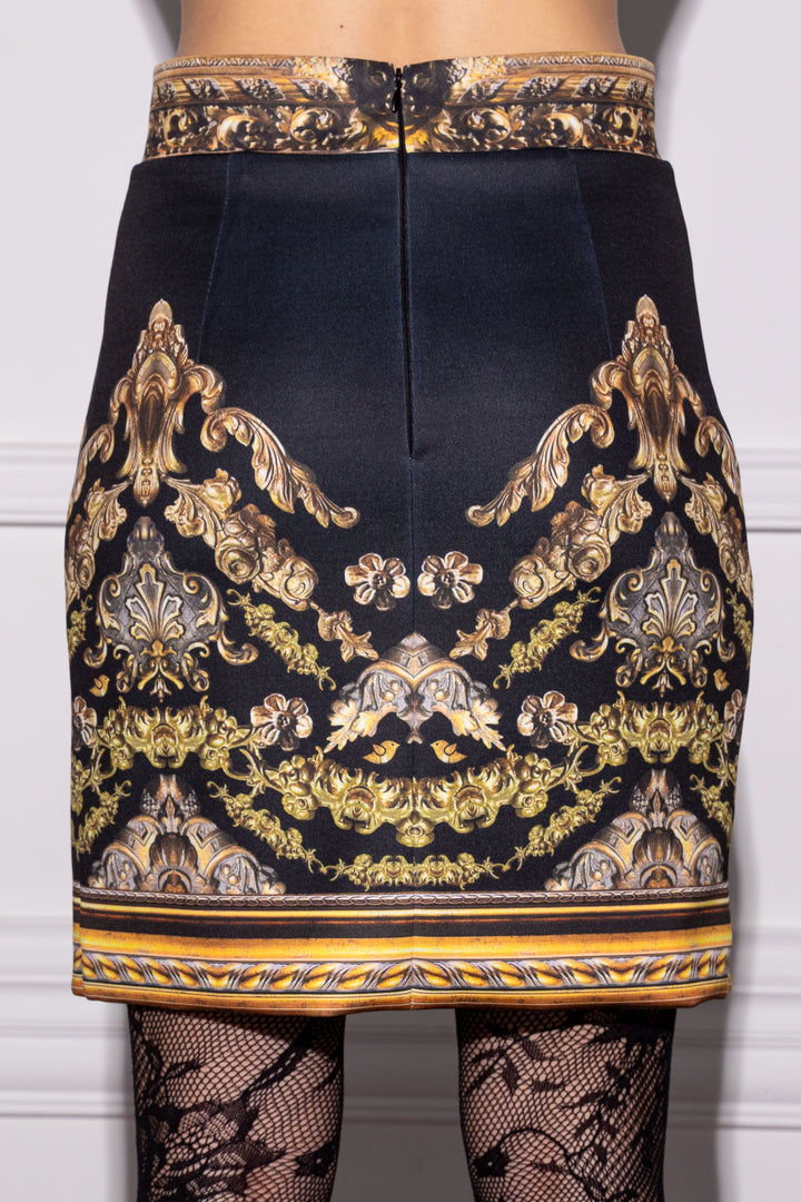 Combközép hosszúságú, alak követő, bélelt szoknya. Háta közepén zipzárral nyitható. Derekát széles, félbehajtott pánt szegi.