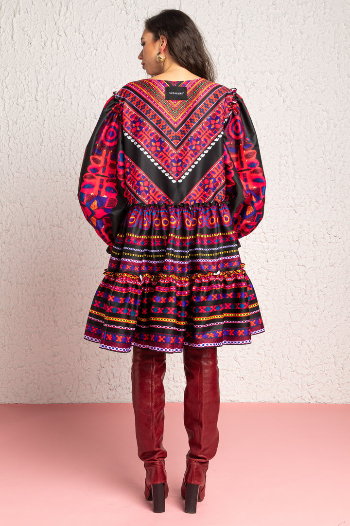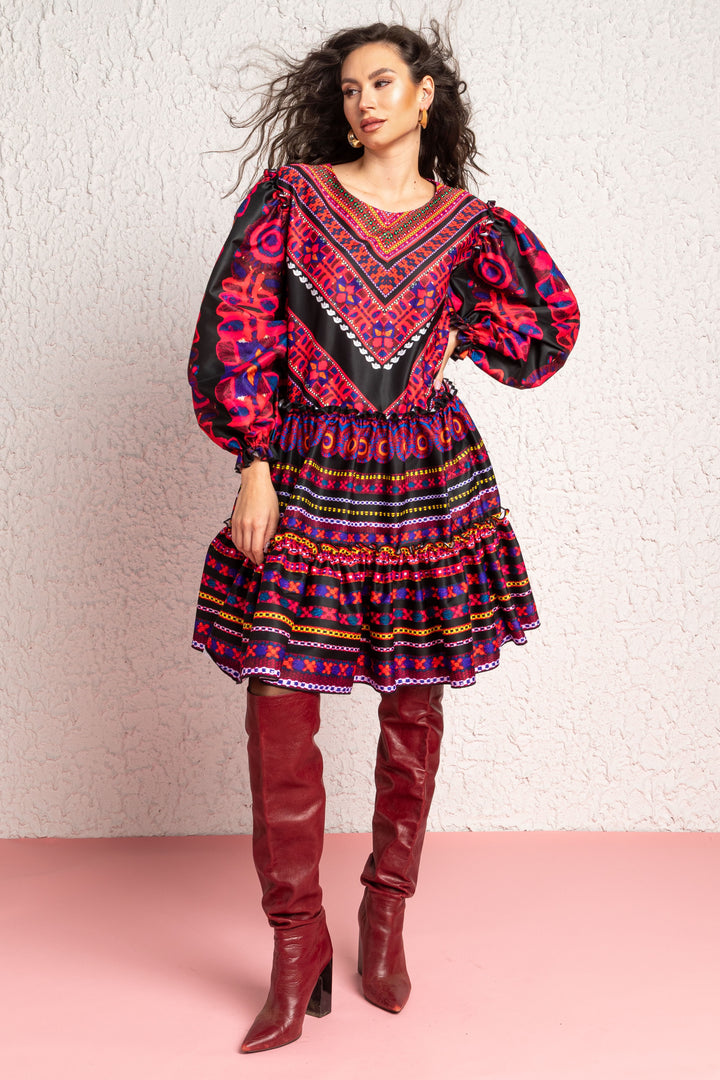 Térd feletti hosszúságú, hosszú ujjú, laza fazonú ruha. Szoknya részét széles és húzott fodrok alkotják, ujja alja gumizott. Vállait keskeny, húzott fodor díszíti. A hátára SUGARBIRD feliratú címkét varrtunk.