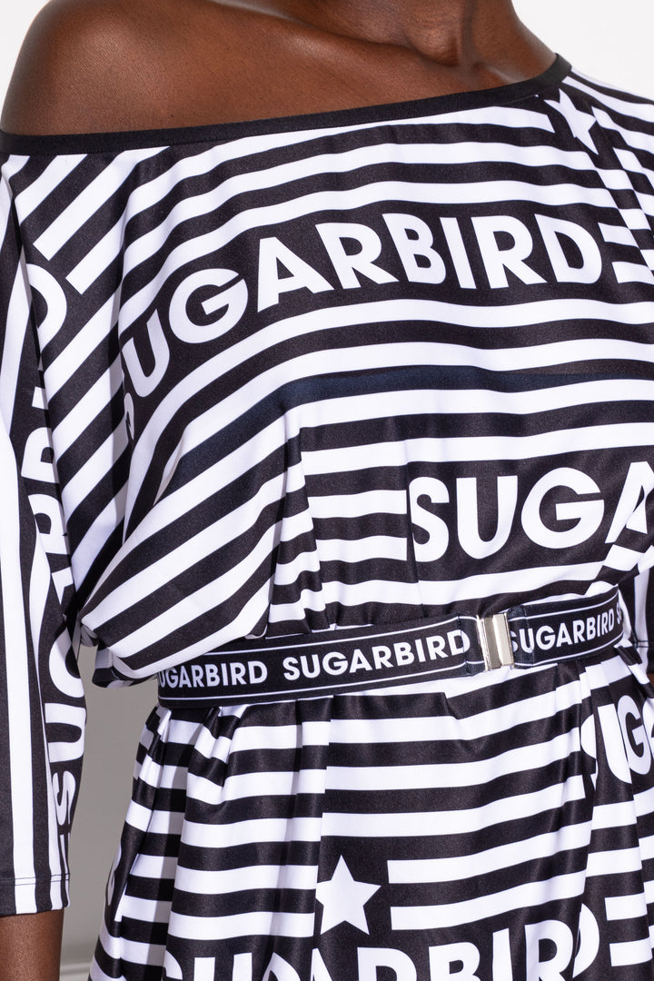 Kedvelt fazonunkat fekete és fehér SUGARBIRD feliratok Sugi madarak printelt mintája díszíti.