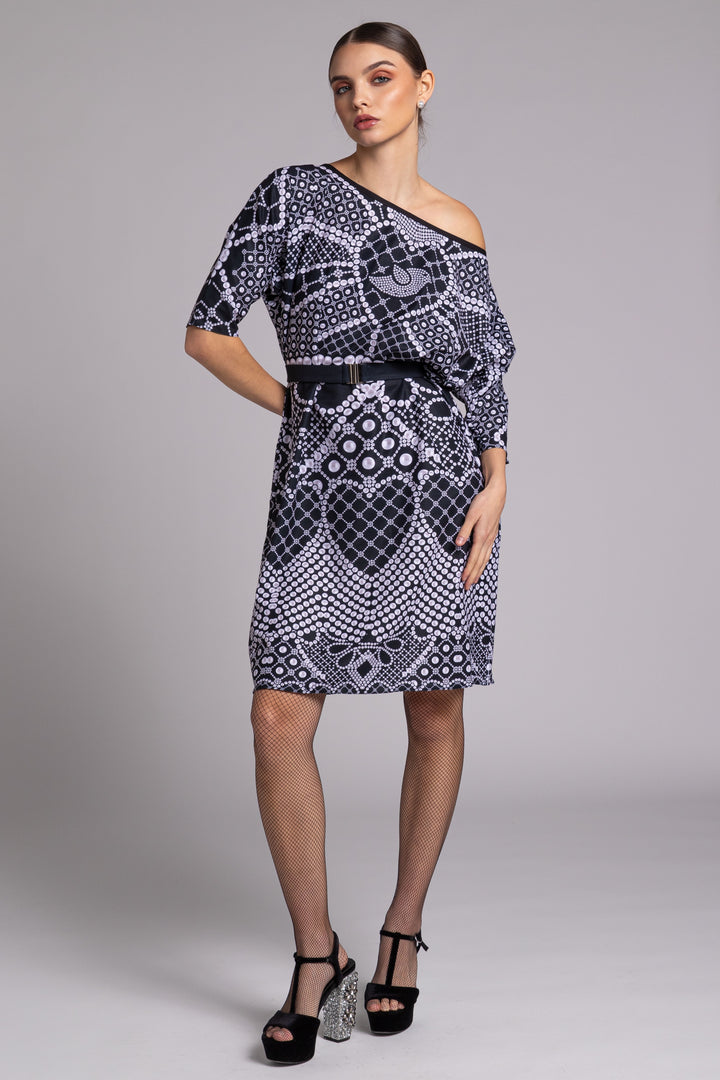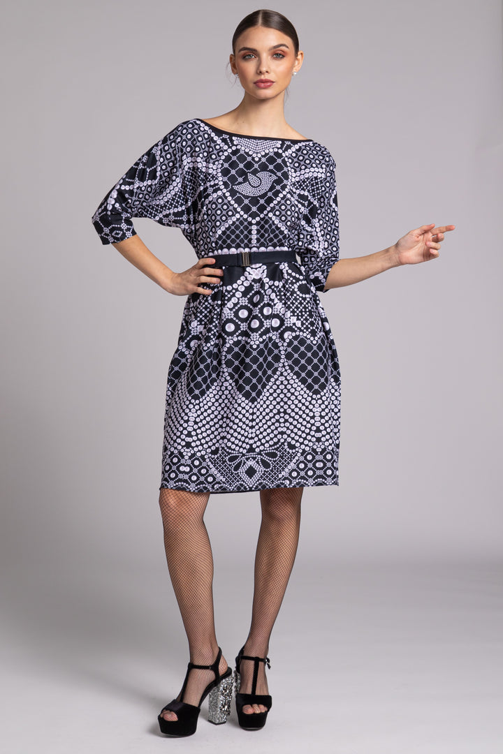 Térd feletti hosszúságú, háromnegyedes ujjú, laza, tunika fazonú ruha. Szélesen kivágott nyakköre gumis pánttal szegett. Hátán fehér masnis kellék és SUGARBIRD feliratú címke díszíti. A ruhához egy külön álló gumis öv is készült, amely fém övcsattal záródik.