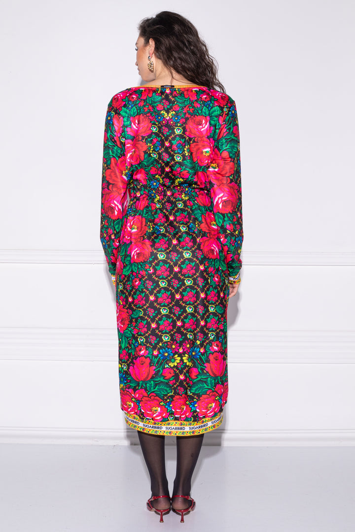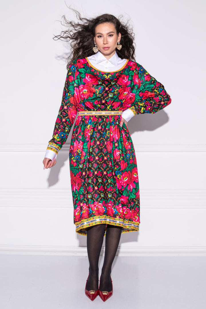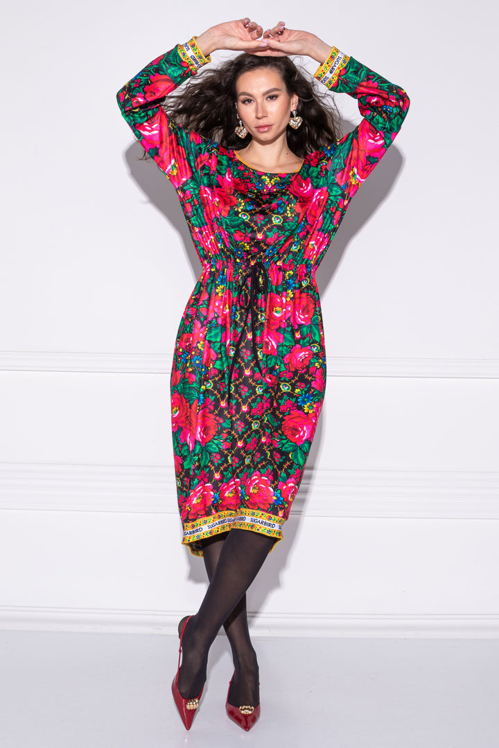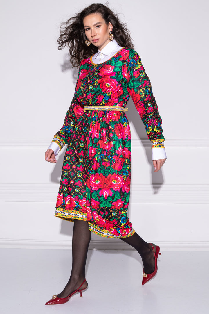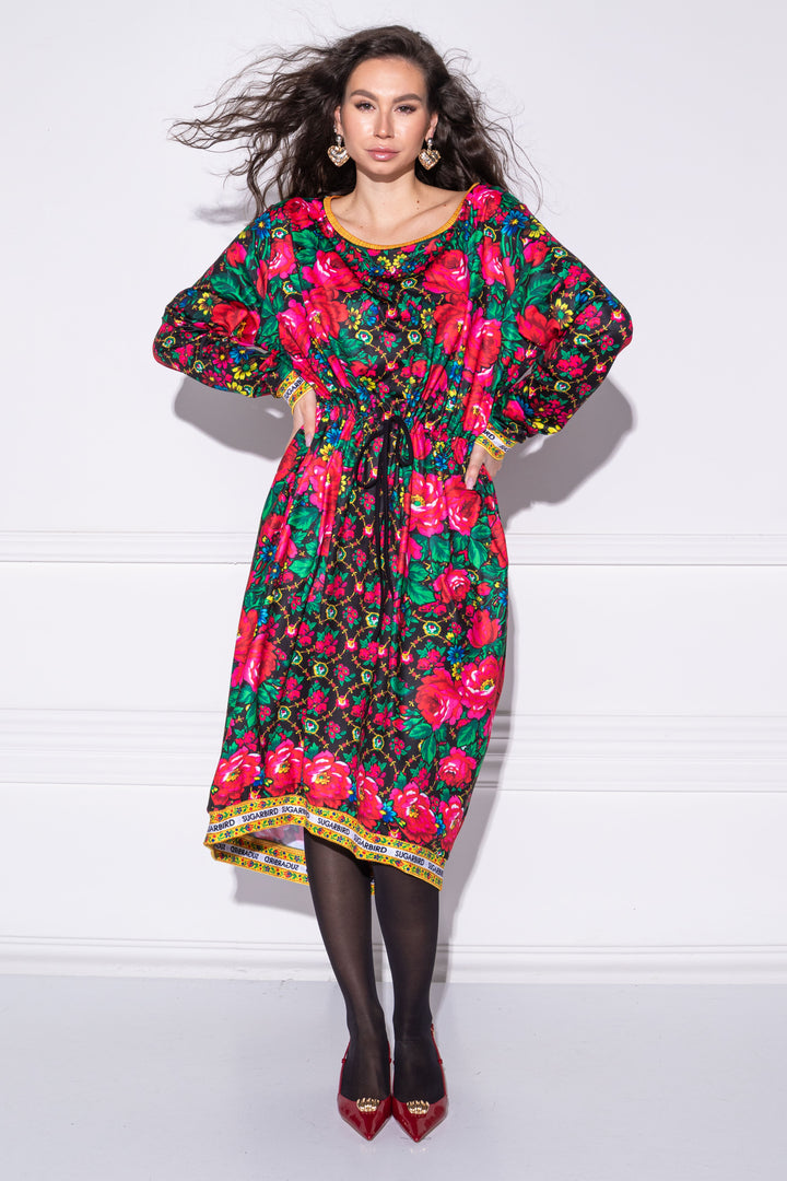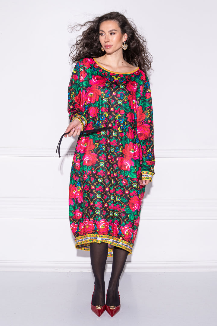 Hosszú ujjú, bő fazonú, vádliközép hosszúságú ruha. Oldalaiba zsebeket helyeztünk. Széles, kerek nyakát, alját és ujja alját félbehajtott pántok szegik. Dereka egy kötő segítségével szűkíthető. Hátán SUGARBIRD feliratú címkével díszítettük.
