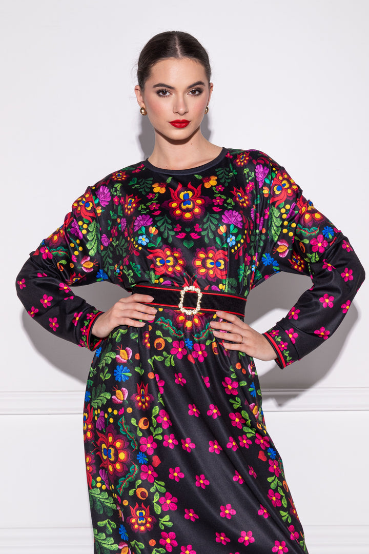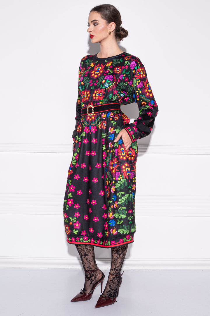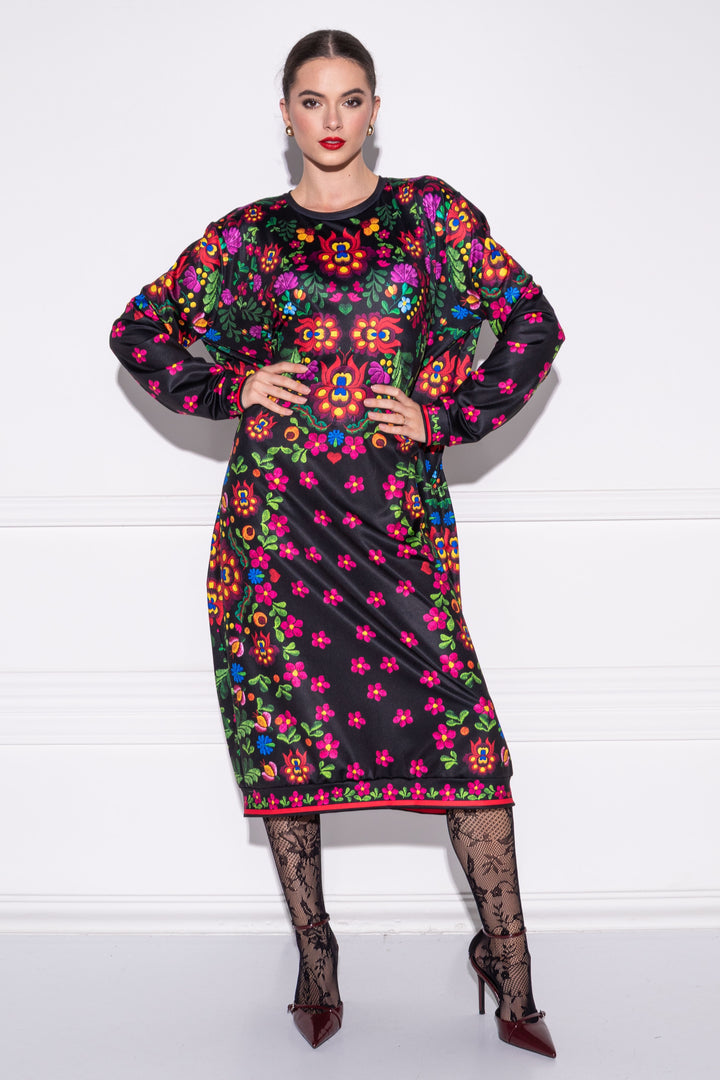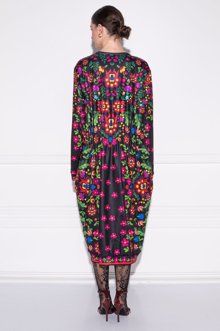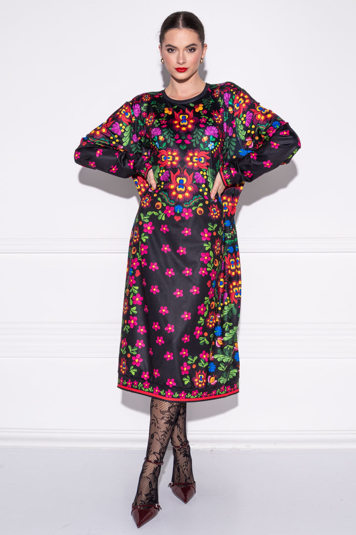 Hosszú ujjú, bő fazonú, vádliközép hosszúságú ruha. Oldalaiba zsebeket helyeztünk. Széles, kerek nyakát, alját és ujja alját félbehajtott pántok szegik. Háta derék magasságban gumizott, nyakánál SUGARBIRD feliratú címkével díszítettük.
