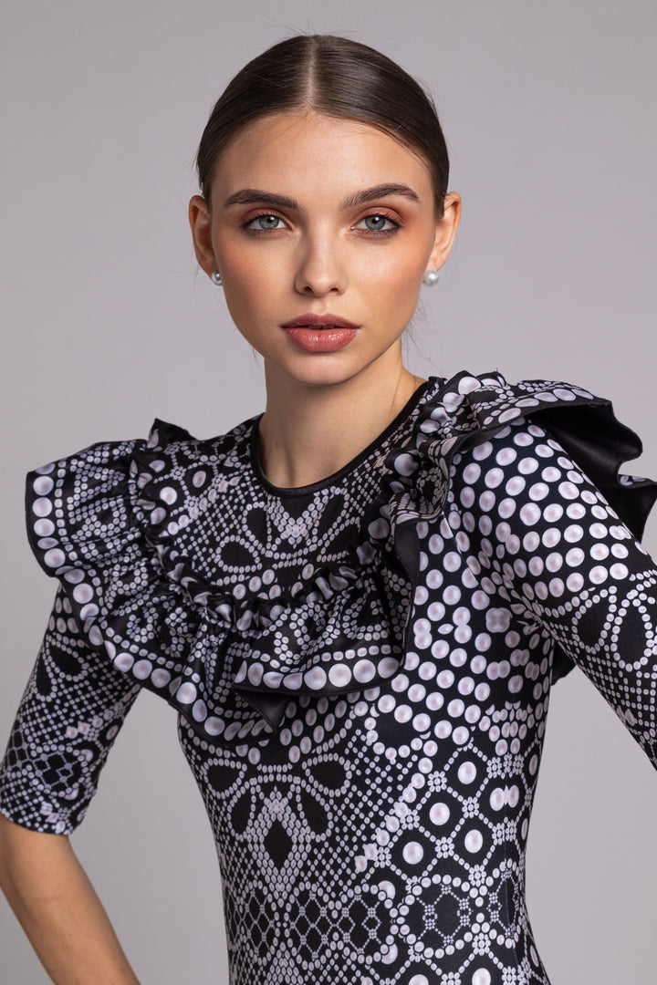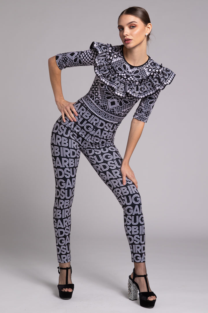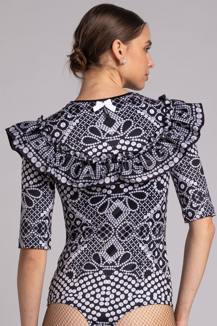 Háromnegyedes ujjú, alak követő body. Zárt és kerek nyakkörét keskeny pánt szegi. A nyakkör alatt széles és húzott fodor fut körben. Alul gumizott combrésszel, ülepén állítható kapoccsal záródik. Hátán fehér masnis kellék és SUGARBIRD feliratú címke díszíti.