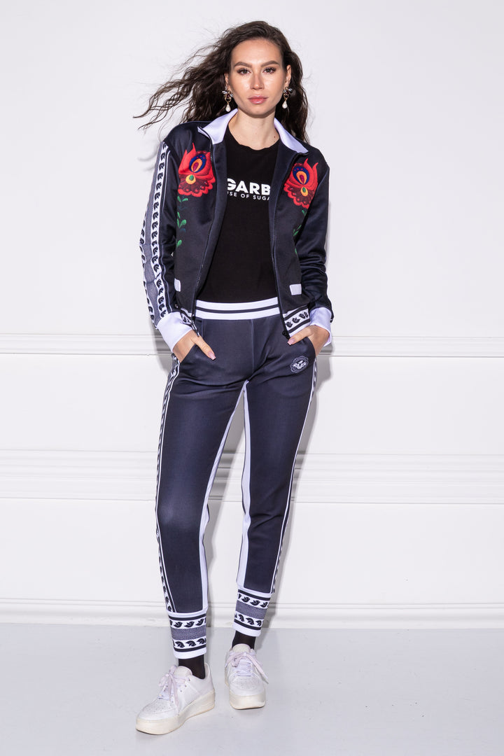 Hosszú ujjú, csípő fölé érő dzseki, melynek nyakát, alját és ujja alját széles pánt szegi. Elejére dísz zsebpatnikat helyeztünk, a test pedig középen, széles zipzárral nyílik. Karöltőjén keskeny, fekete pánt fut körbe. Oldalán SUGARBIRD feliratú címkével díszítettük.