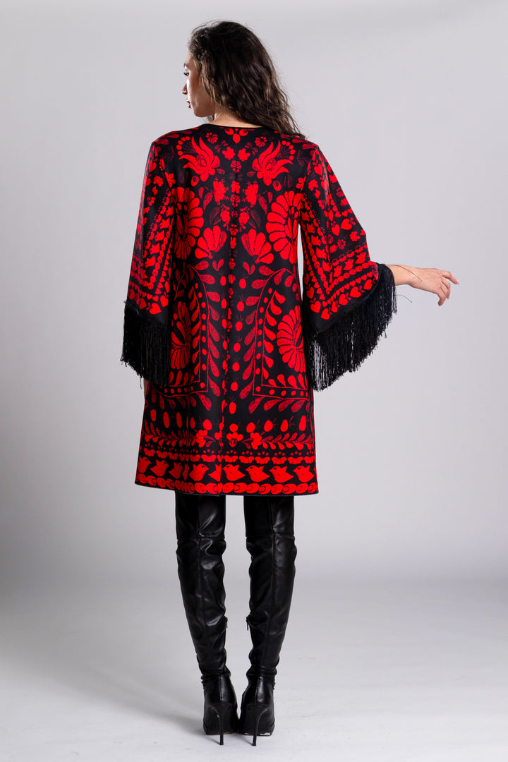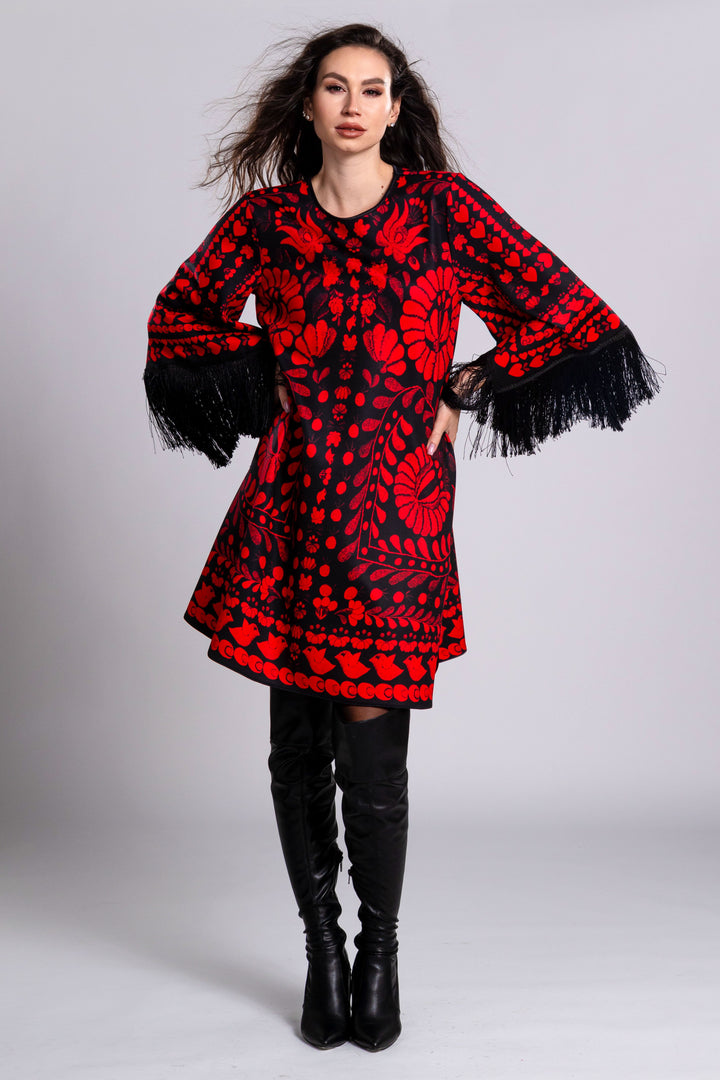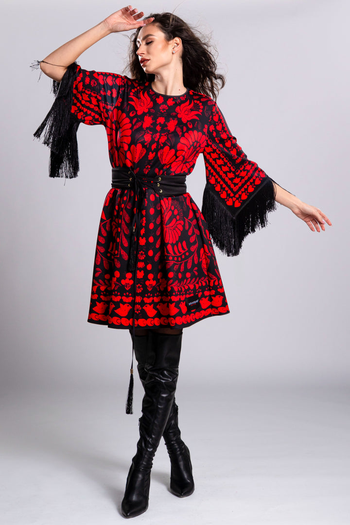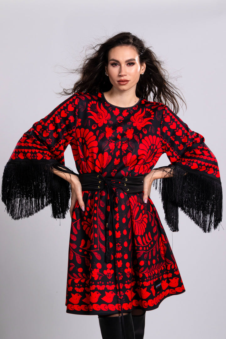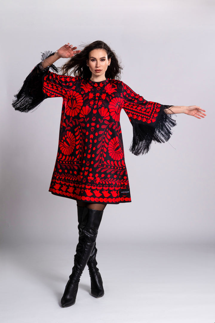 Combközép hosszúságú, hosszú és bő ujjú, laza fazonú ruha. Zárt és kerek kivágású nyakát keskeny pánt szegi. Ujja alját széles, rojtos kellék díszíti. Elejére SUGARBIRD MATYÓ feliratú címkét varrtunk.