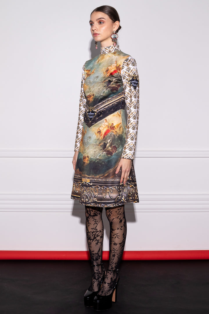 Térd feletti hosszúságú, hosszú ujjú ruha. Felső része alak követő, szoknya része enyhén bővülő. Nyakát széles pánt szegi, háta közepén zipzárral nyitható.