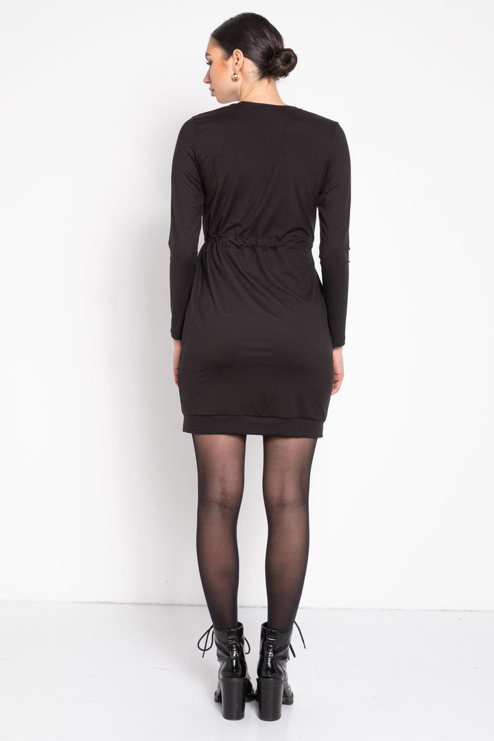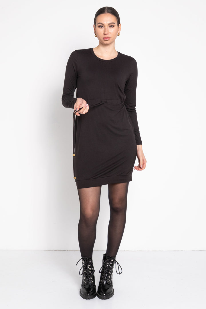 Combközép hosszúságú, hosszú ujjú, alak követő ruha. Kerek kivágású nyakát keskeny, alját széles félbehajtott pánt szegi. Derekán egy keskeny, fém végzáróval ellátott kötő segítségével derékra szűkíthető. Ujján SUGARBIRD feliratú címkével díszítettük.