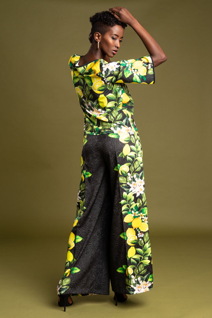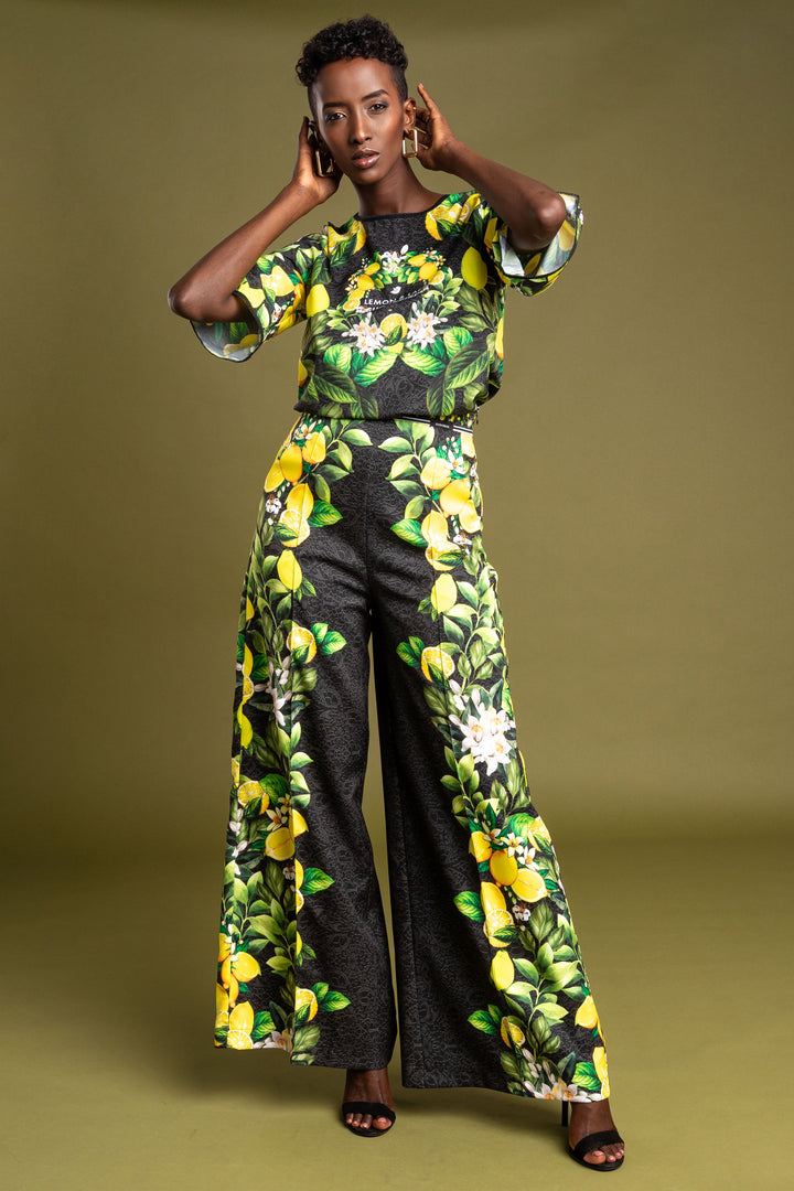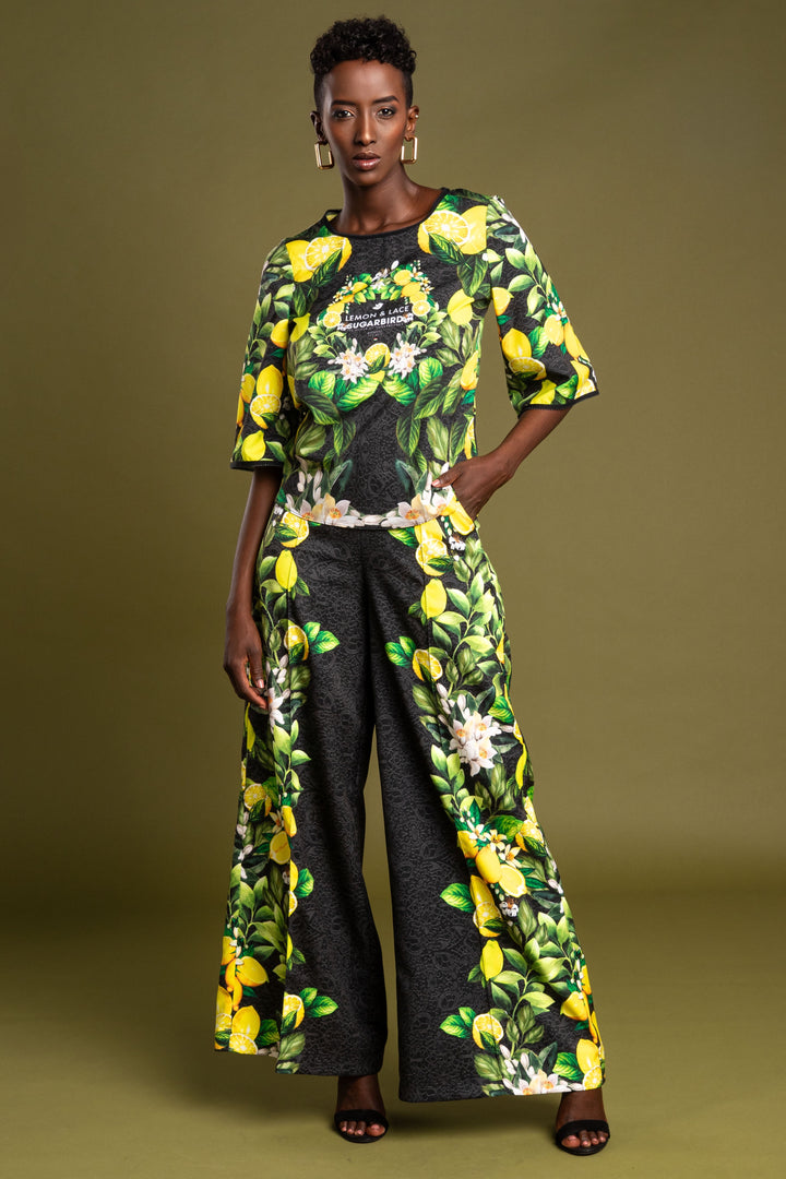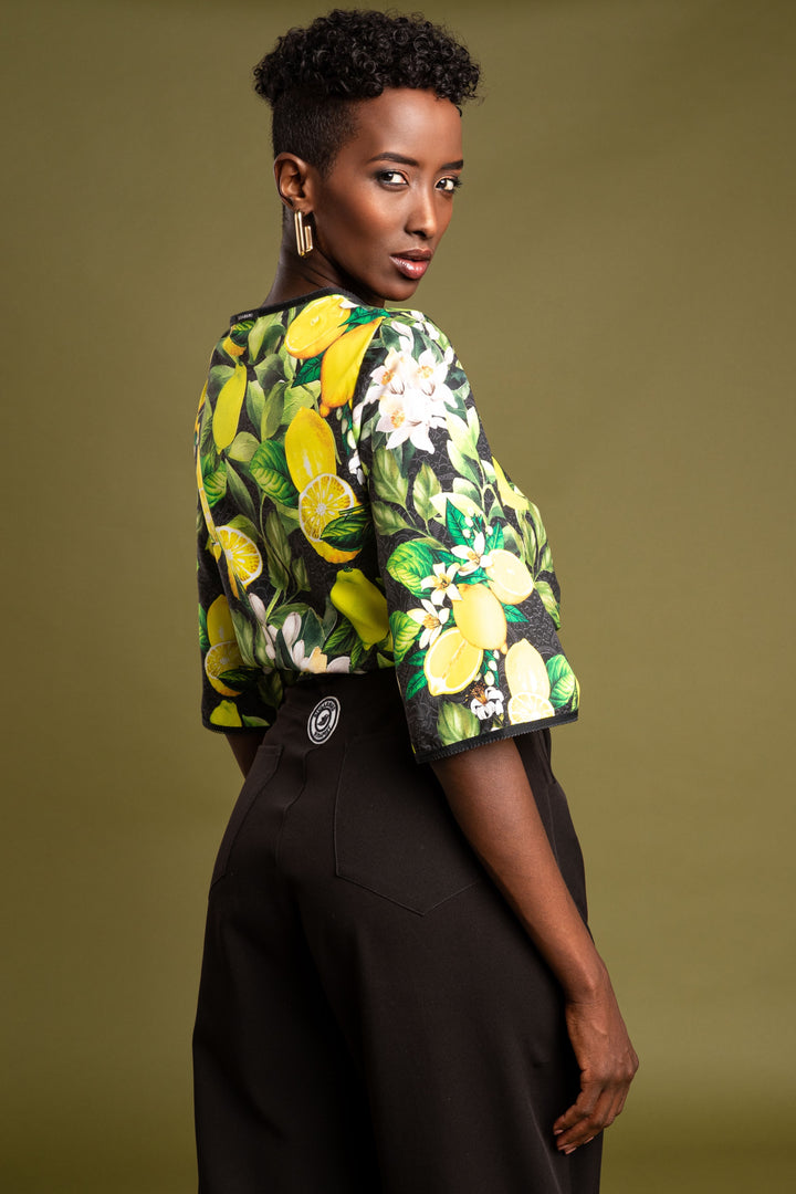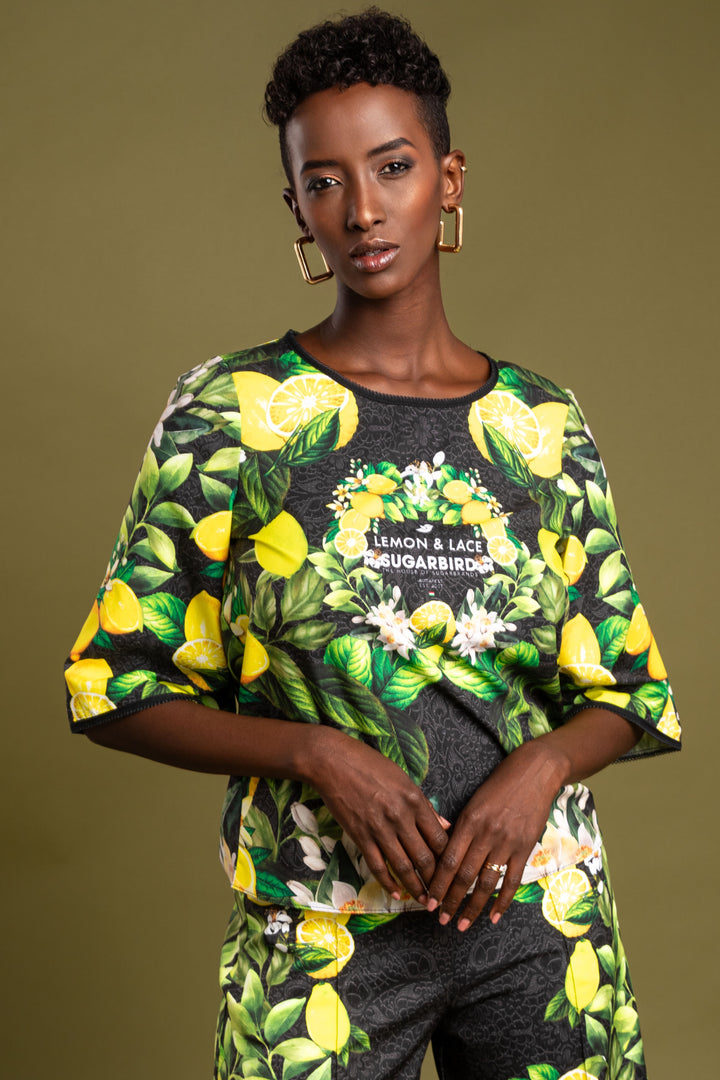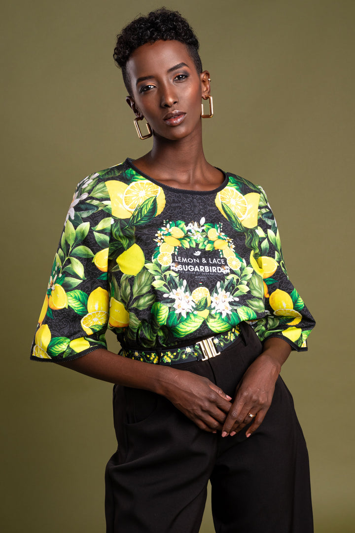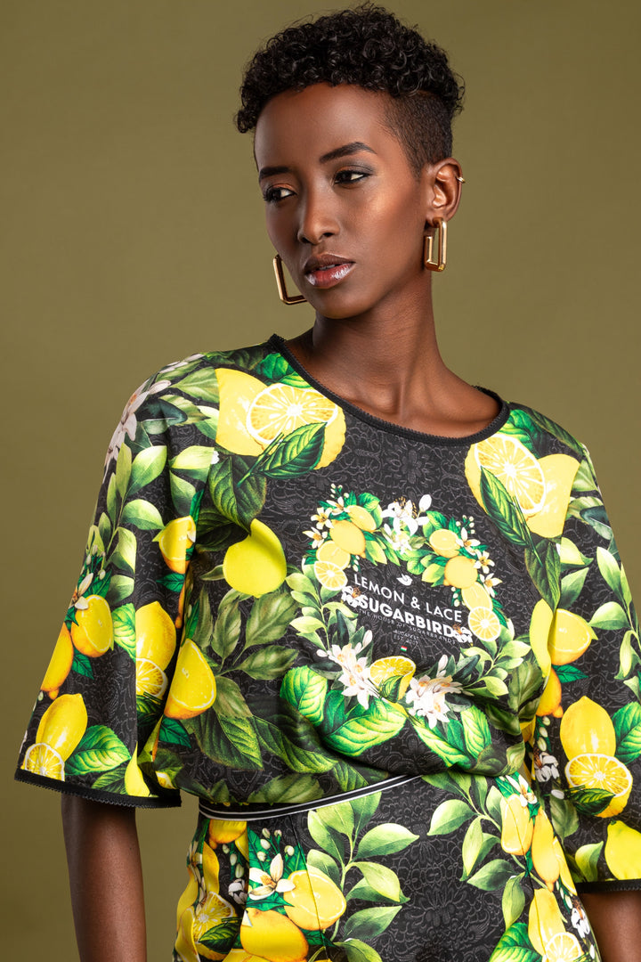 Frissítsd fel ruhatárad legújabb kollekciónkkal. Szerezd be kedvenc fazonod, melynek mintáját fekete csipke alapon citromok, levelek és virágaik printelt grafikái díszítik.