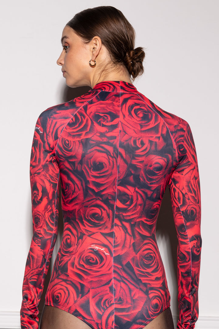 Zárt, álló gallérú, alak követő, hosszú, raglán ujjú body. Alján gumizott combrésszel, ülepén állítható kapoccsal záródik. Bal ujjának aljára kicsi SUGARBIRD feliratú címkét varrtunk.