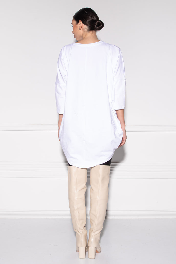 Combközépig érő, hosszú ujjú, bő fazonú tunika. Kerek és zárt kivágású nyaka keskeny pánttal szegett.