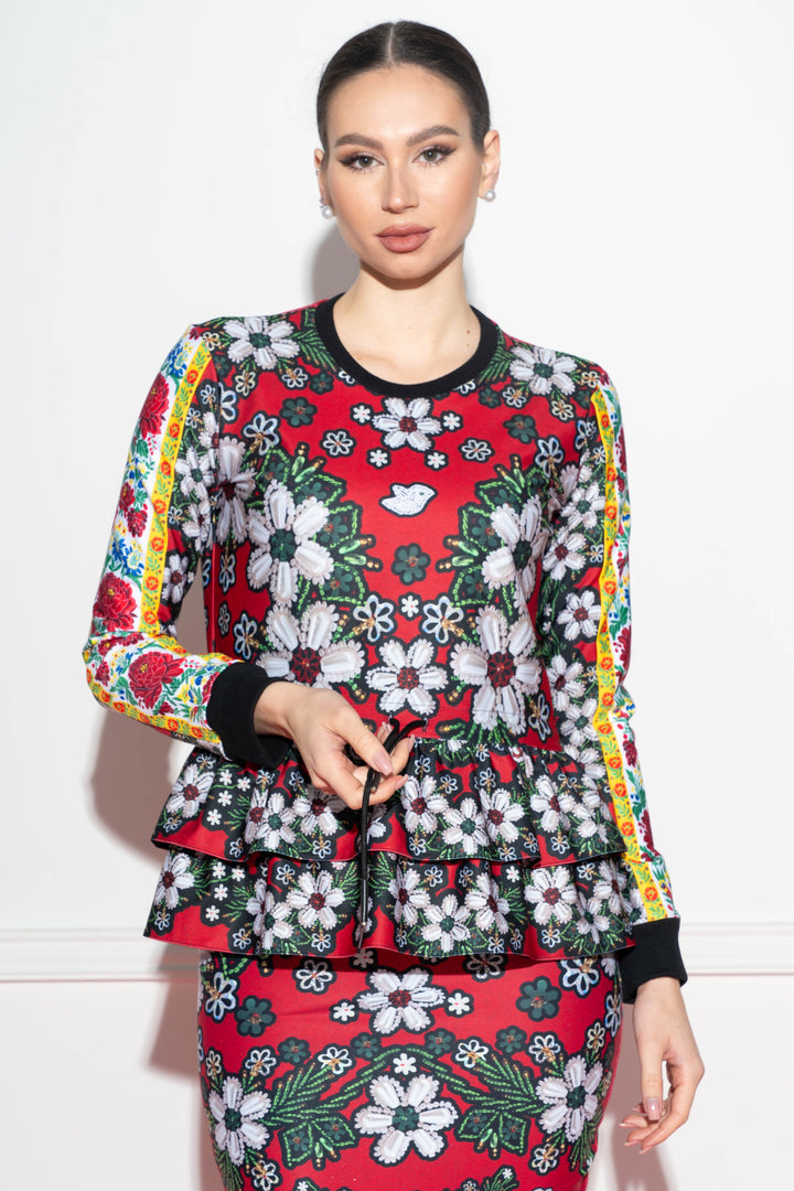 Csípő alá érő, hosszú ujjú, alak követő felső. Zárt, kerek nyakkivágása és az ujja alja passzé anyagú pántokkal szegett. Derekán egy kötő segítségével szűkíthető, alja fodorban végződik. Hátán SUGARBIRD feliratú címke díszíti.