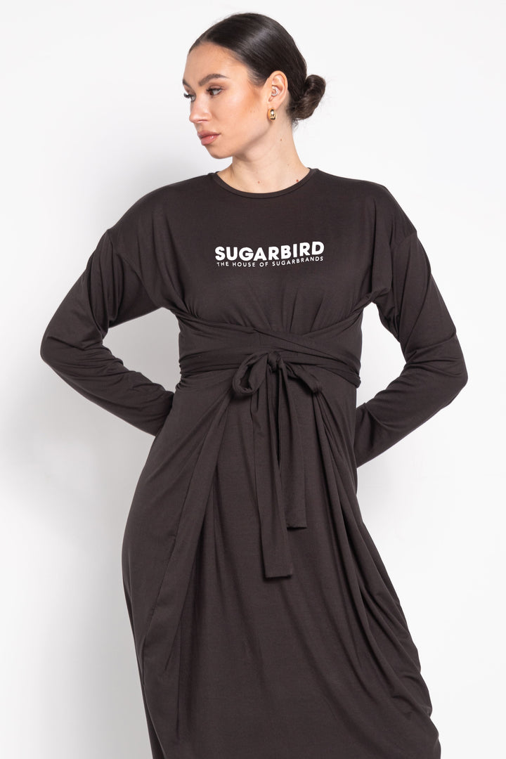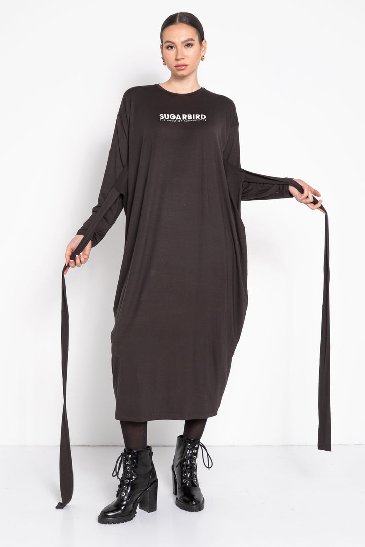 Hosszú és bő szárú, hosszú ujjú, lazafazonú overál. Zárt nyakkivágása keskeny pánttal szegett a hátán egy hasíték felett gombbal záródik. Oldalába rögzített hosszú kötőjével a derékon többször átfűzhető. Ujján SUGARBIRD feliratú címkével díszítettük.