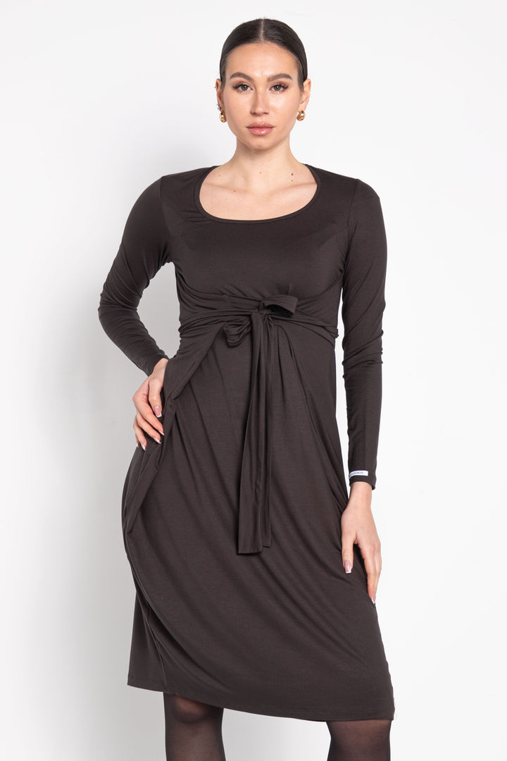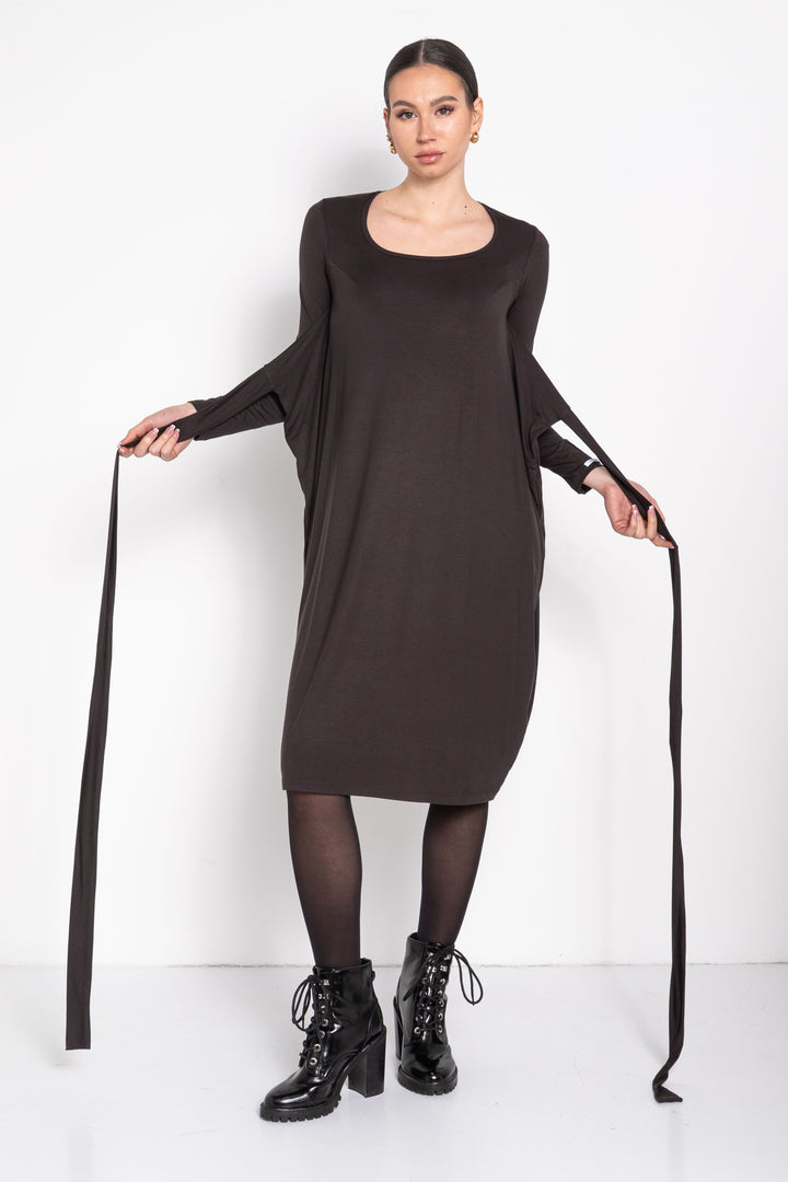 Térd alatti hosszúságú, hosszú ujjú, laza fazonú ruha. Mély és kerek nyakkivágása keskeny pánttal szegett. Oldalába rögzített hosszú kötőjével a derékon többször átfűzhető. Ujján SUGARBIRD feliratú címkével díszítettük.