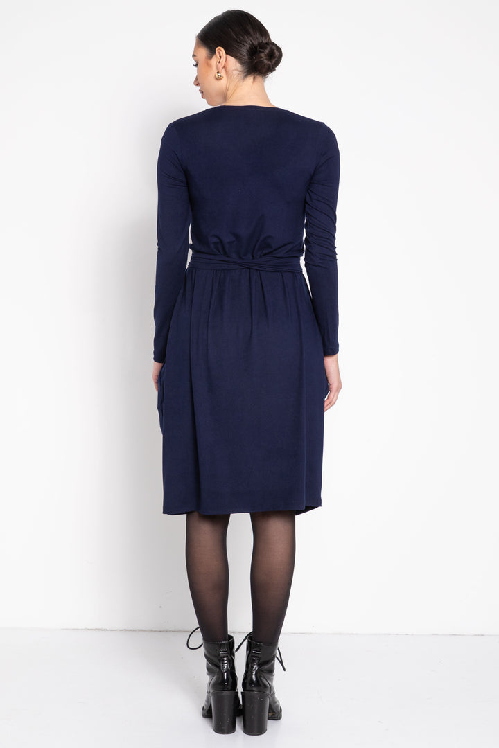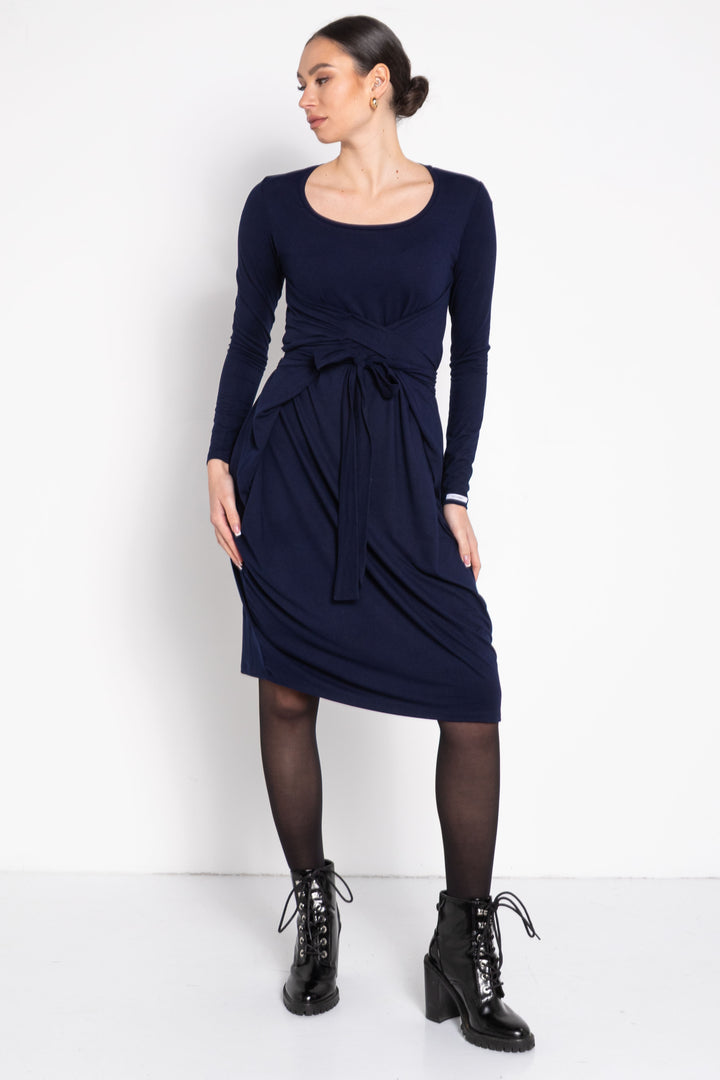 Térd alatti hosszúságú, hosszú ujjú, laza fazonú ruha. Mély és kerek nyakkivágása keskeny pánttal szegett. Oldalába rögzített hosszú kötőjével a derékon többször átfűzhető. Ujján SUGARBIRD feliratú címkével díszítettük.