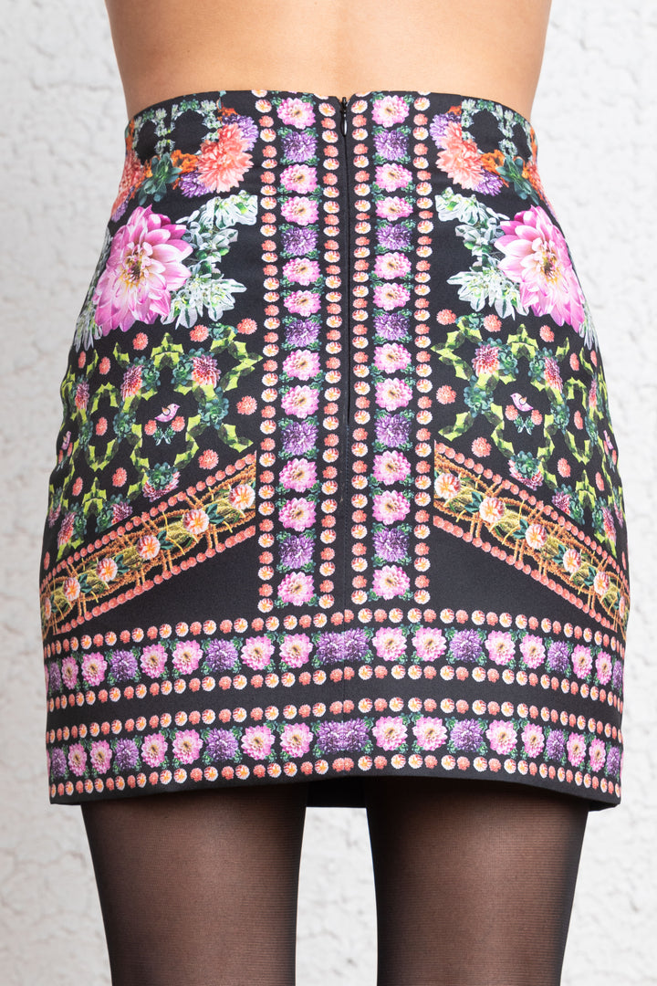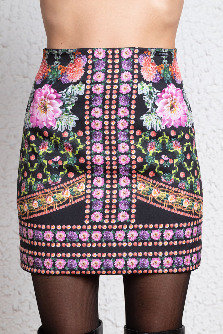 Combközép hosszúságú, alak követő, bélelt szoknya. Derekán szűkítőkkel formázott, a háta közepén zipzárral nyitható. Elejére SUGARBIRD feliratú címkét varrtunk.