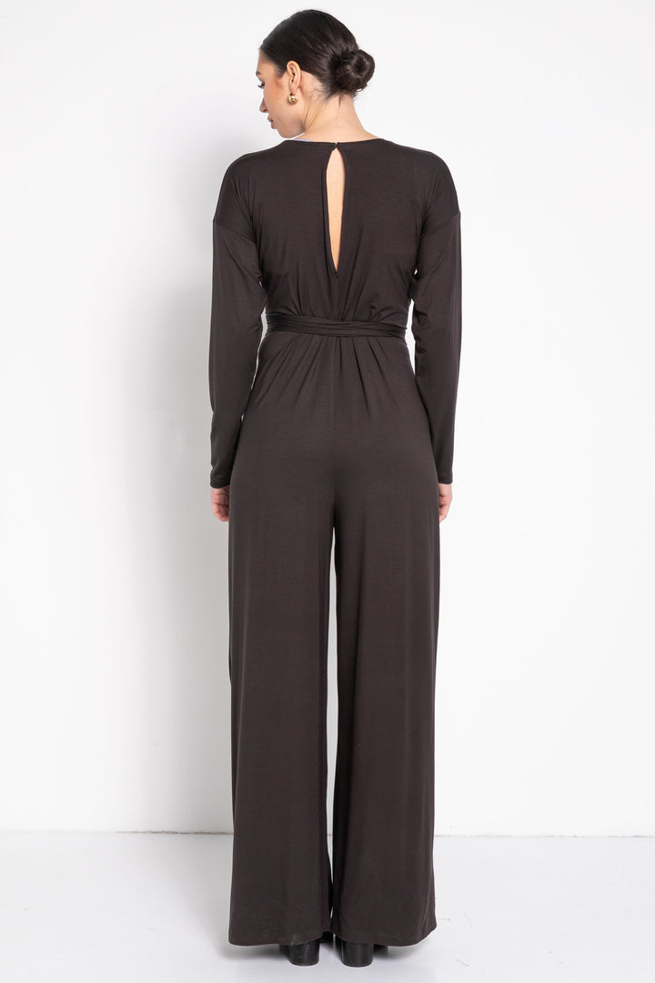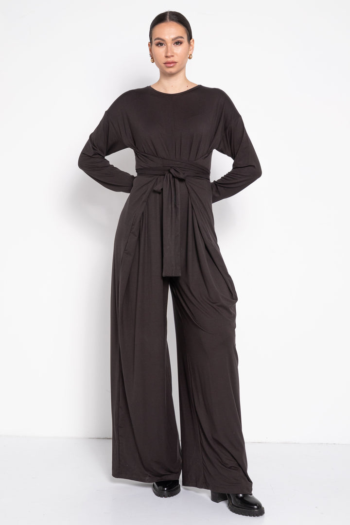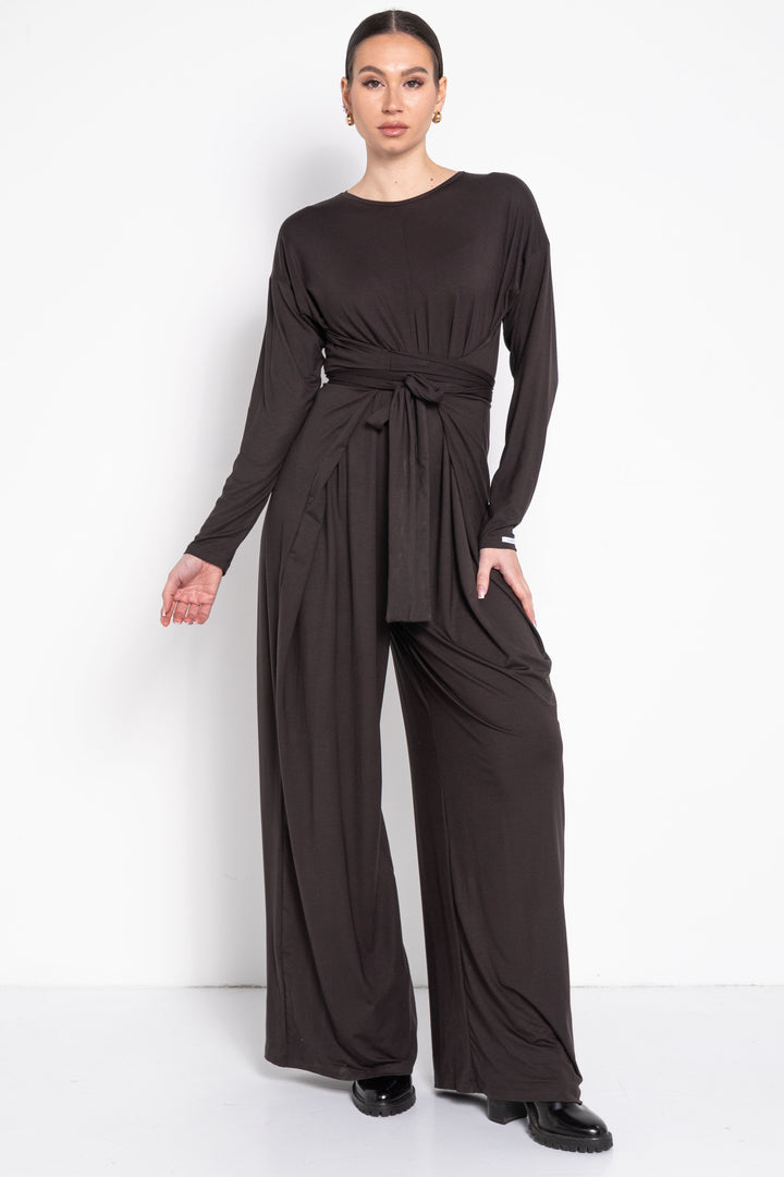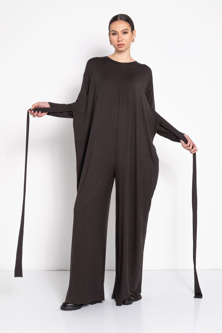 Hosszú és bő szárú, hosszú ujjú, lazafazonú overál. Zárt nyakkivágása keskeny pánttal szegett a hátán egy hasíték felett gombbal záródik. Oldalába rögzített hosszú kötőjével a derékon többször átfűzhető. Ujján SUGARBIRD feliratú címkével díszítettük.