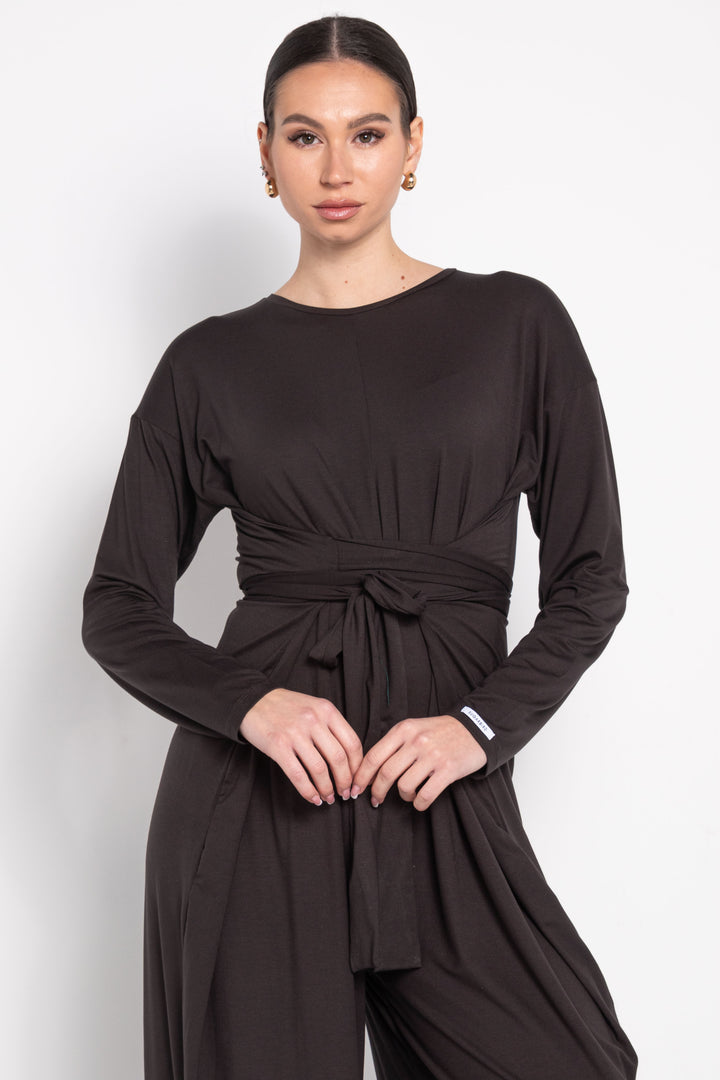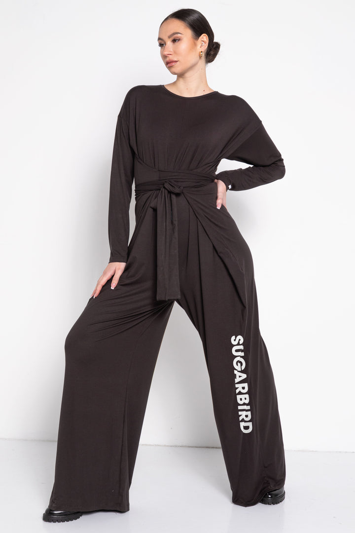 Hosszú és bő szárú, hosszú ujjú, lazafazonú overál. Zárt nyakkivágása keskeny pánttal szegett a hátán egy hasíték felett gombbal záródik. Oldalába rögzített hosszú kötőjével a derékon többször átfűzhető. Ujján SUGARBIRD feliratú címkével díszítettük.