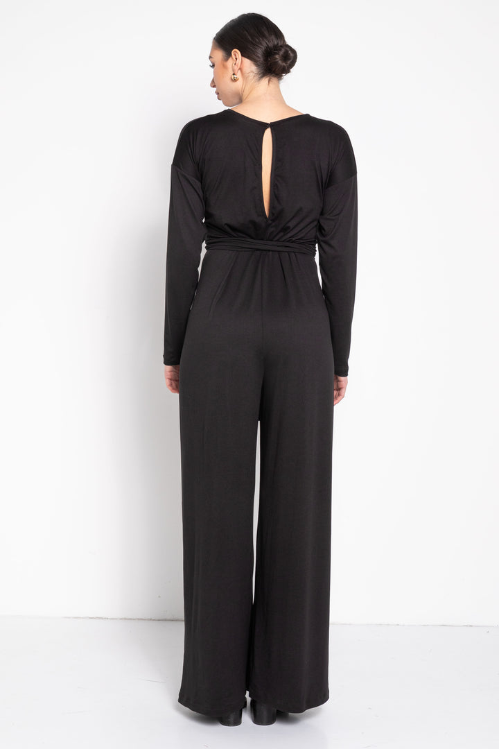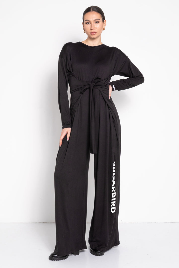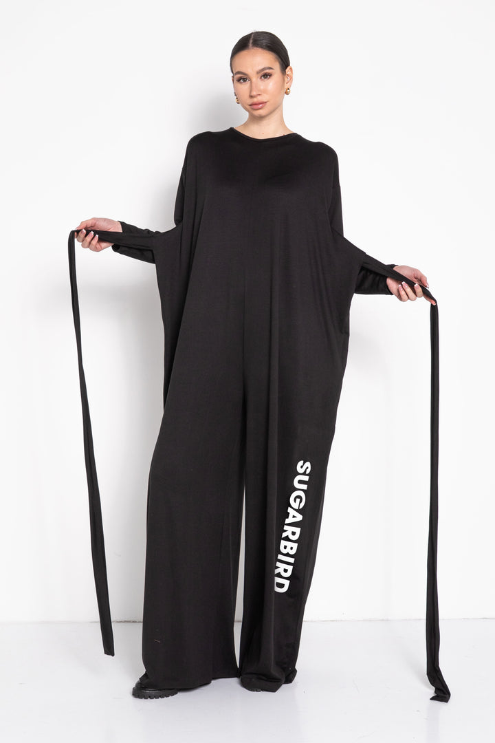 Hosszú és bő szárú, hosszú ujjú, lazafazonú overál. Zárt nyakkivágása keskeny pánttal szegett a hátán egy hasíték felett gombbal záródik. Oldalába rögzített hosszú kötőjével a derékon többször átfűzhető. Ujján SUGARBIRD feliratú címkével díszítettük.