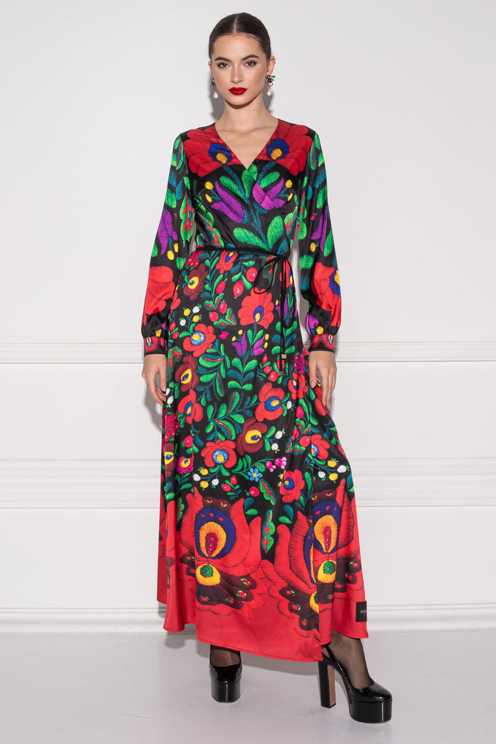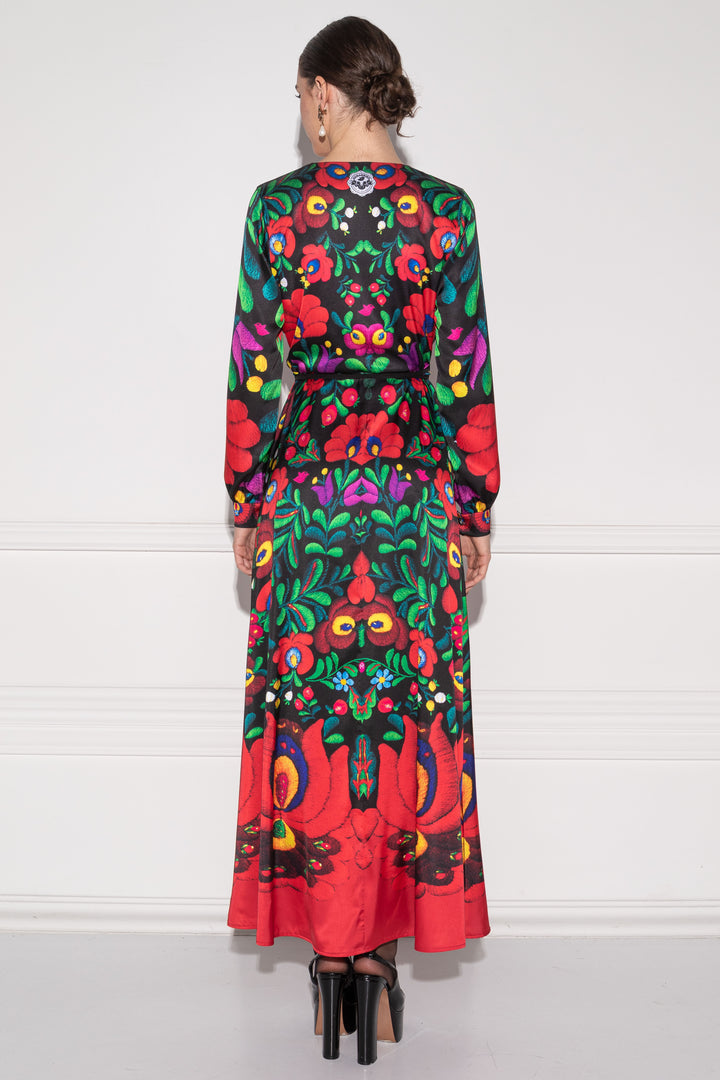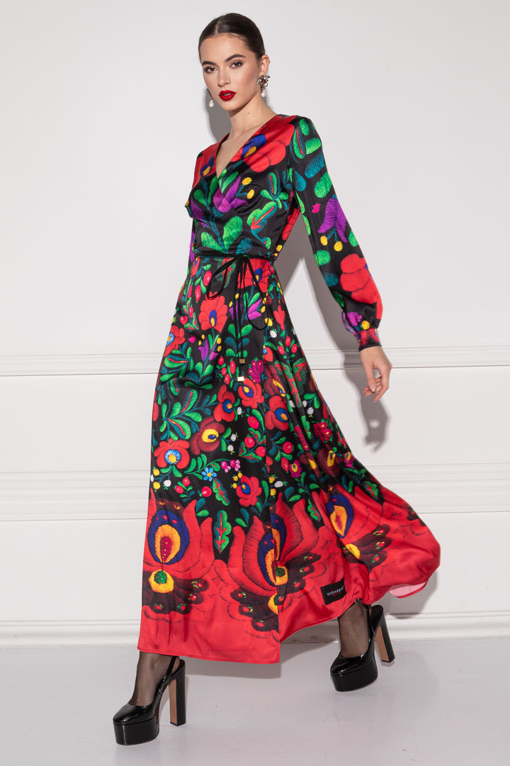 Hosszú és puffos ujjú, maxi hosszúságú, laza fazonú ruha. Elején átlapolt, szoknya része „A” vonalú. Az ujja alját pánt szegi, derekán a hosszú kötőknek köszönhetően méretre szűkíthető a fazon. Elejére SUGARBIRD MATYÓ feliratú címkét helyeztünk.