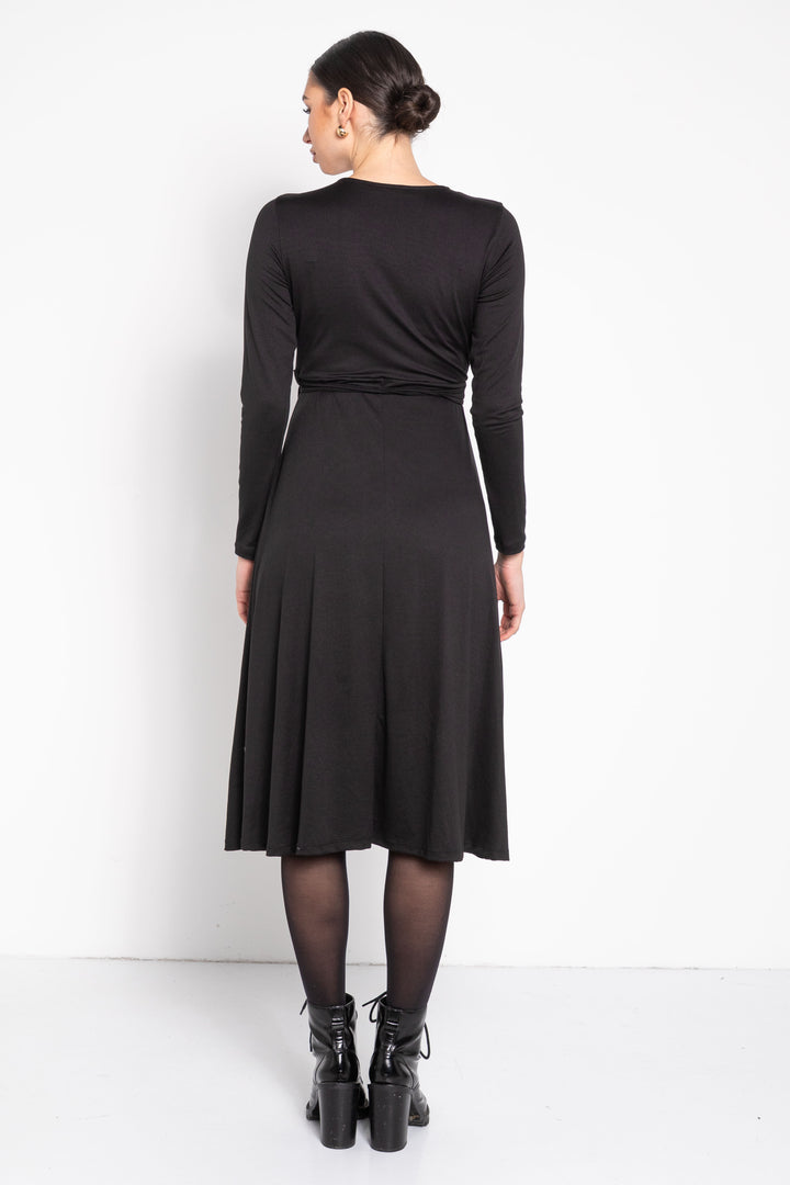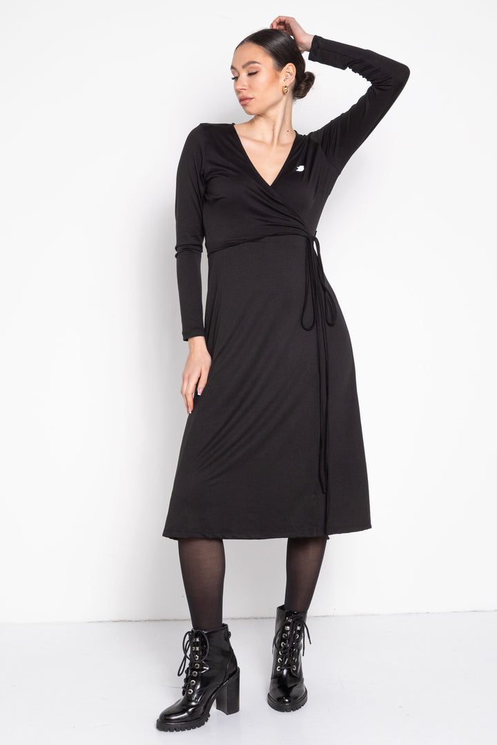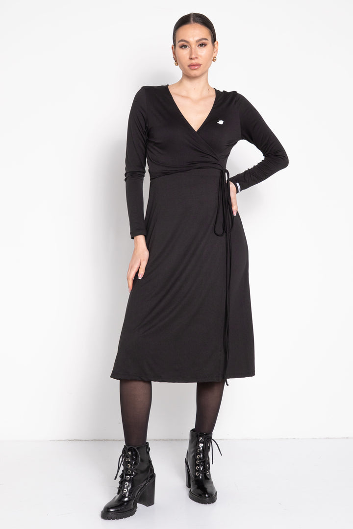Térd alatti hosszúságú, hosszú ujjú, laza fazonú ruha. Szoknya része bővülő „A” vonalú, eleje átlapolt. Derekán egy rögzített keskeny és hosszú, fém végzáróval ellátott kötővel rögzíthető és többször átfűzhető. Ujján SUGARBIRD feliratú címkével díszítettük.