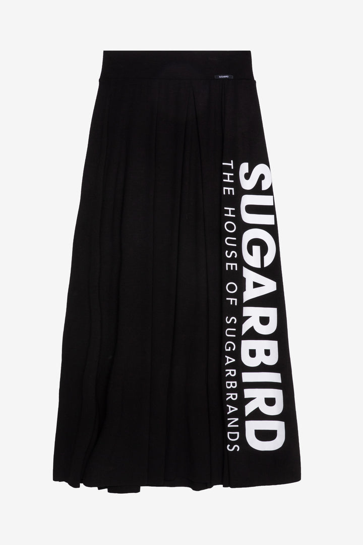 Elején és hátán is két-két szembehajtással ellátott, maxi szoknya. Derékpántja széles és gumizott. Elejére SUGARBIRD feliratú címkét varrtunk.