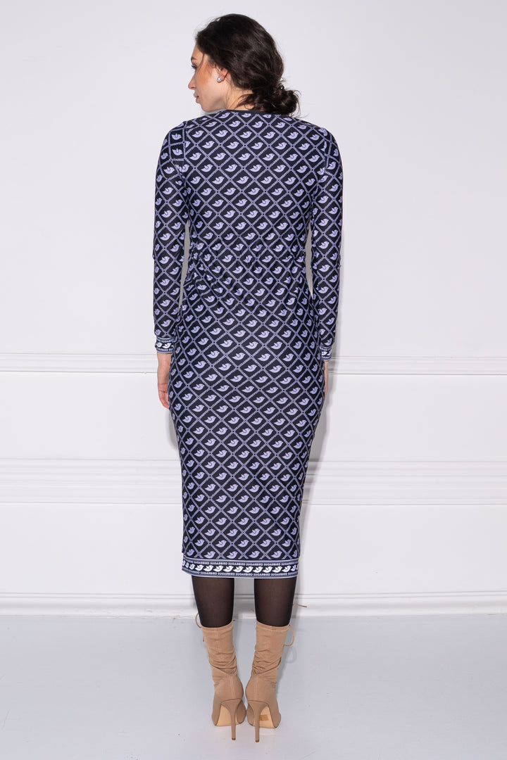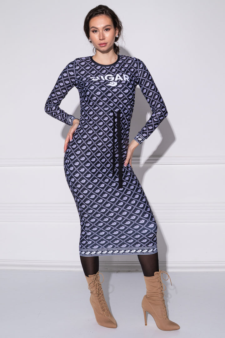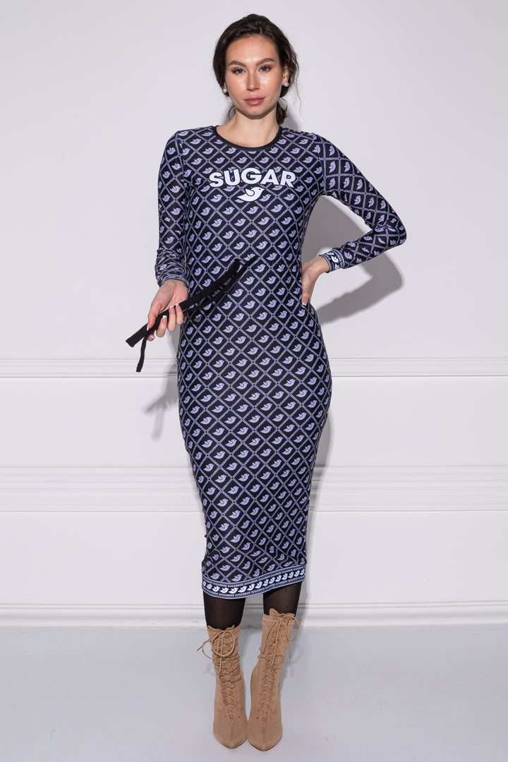 Hosszú ujjú, vádli közép hosszúságú, alak követő ruha. Zárt kerek nyaka, alja és ujja alja félbe hajtott pántokkal szegettek. Dereka egy széles kötő által szűkíthető. A fazonra SUGARBIRD feliratú címkét varrtunk.