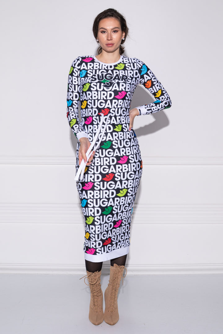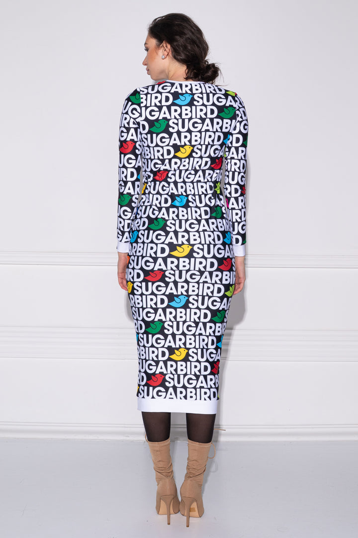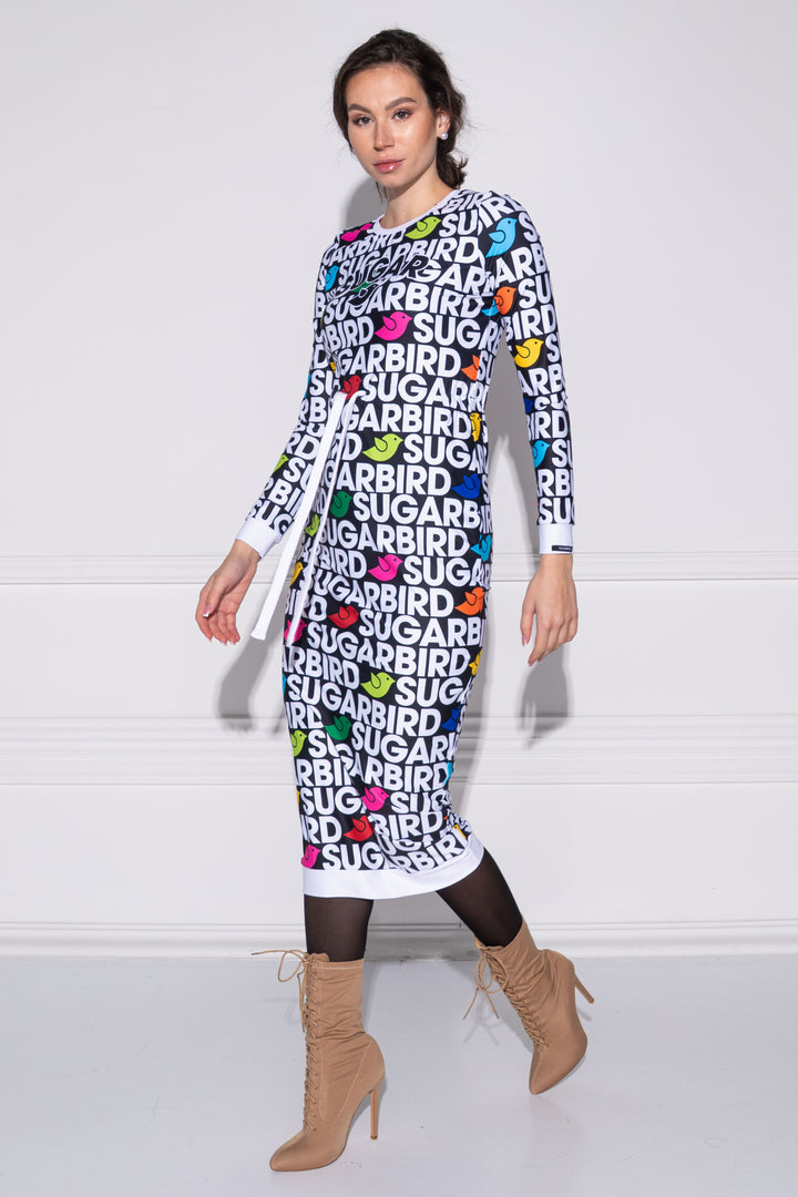 Hosszú ujjú, vádli közép hosszúságú, alak követő ruha. Zárt kerek nyaka, alja és ujja alja félbe hajtott pántokkal szegettek. Dereka egy széles kötő által szűkíthető. A fazonra SUGARBIRD feliratú címkét varrtunk.