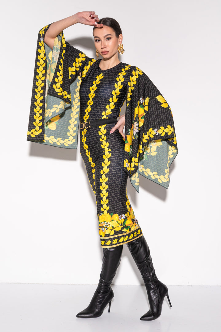 Vádliközép hosszúságú, alak követő ruha. Hosszú ujjai széles, kendő formában, szabadon lebegnek. Zárt és kerek nyakát keskeny pánt szegi. Hátán masnis kellék és SUGARBIRD feliratú címke díszíti.