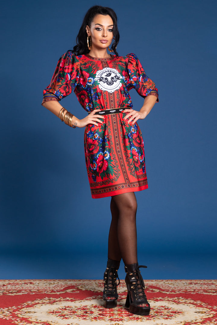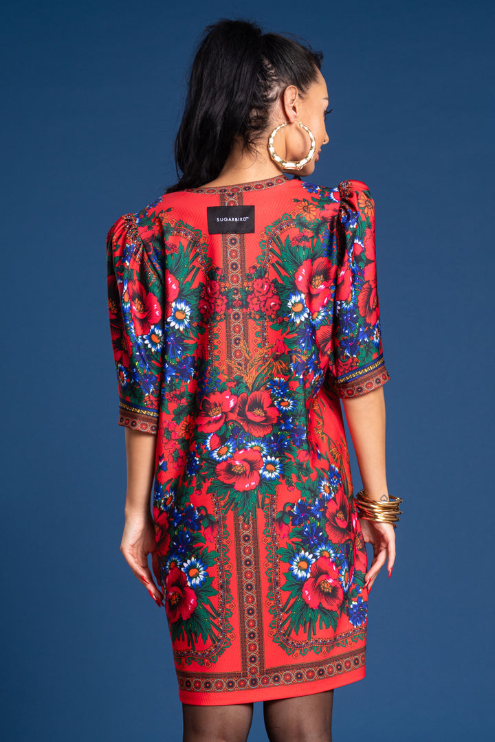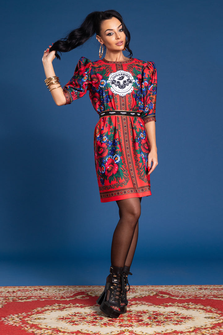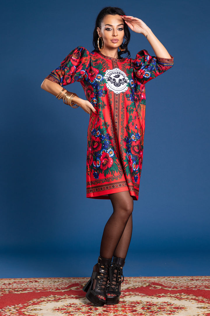 Térd feletti hosszúságú, háromnegyedes és puffos ujjú, laza, egyenes fazonú ruha. Kerek nyakkivágása félbehajtott pánttal szegett. Hátára SUGARBIRD feliratú címkét varrtunk.