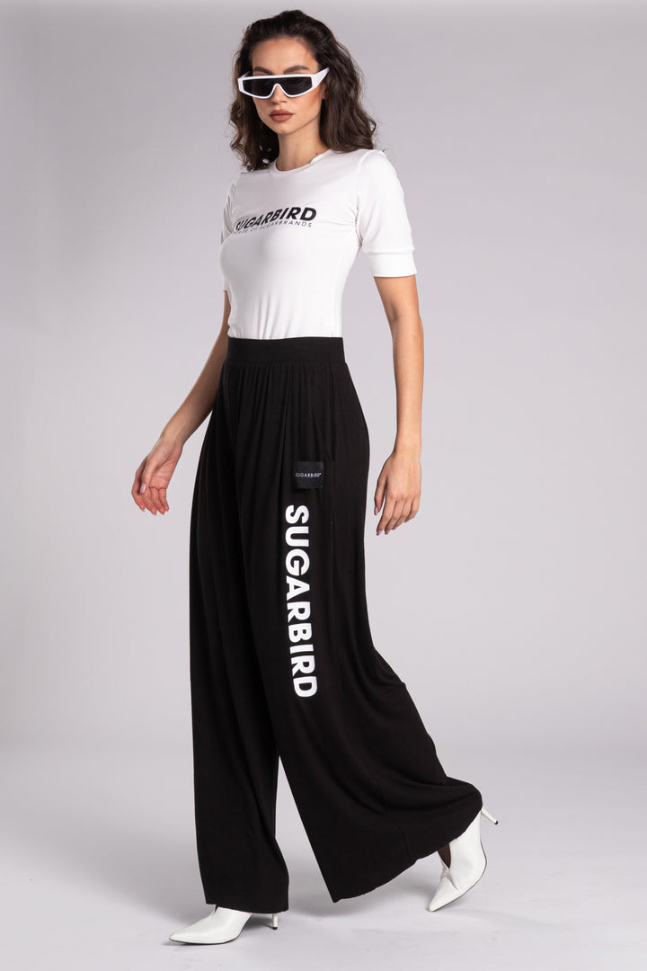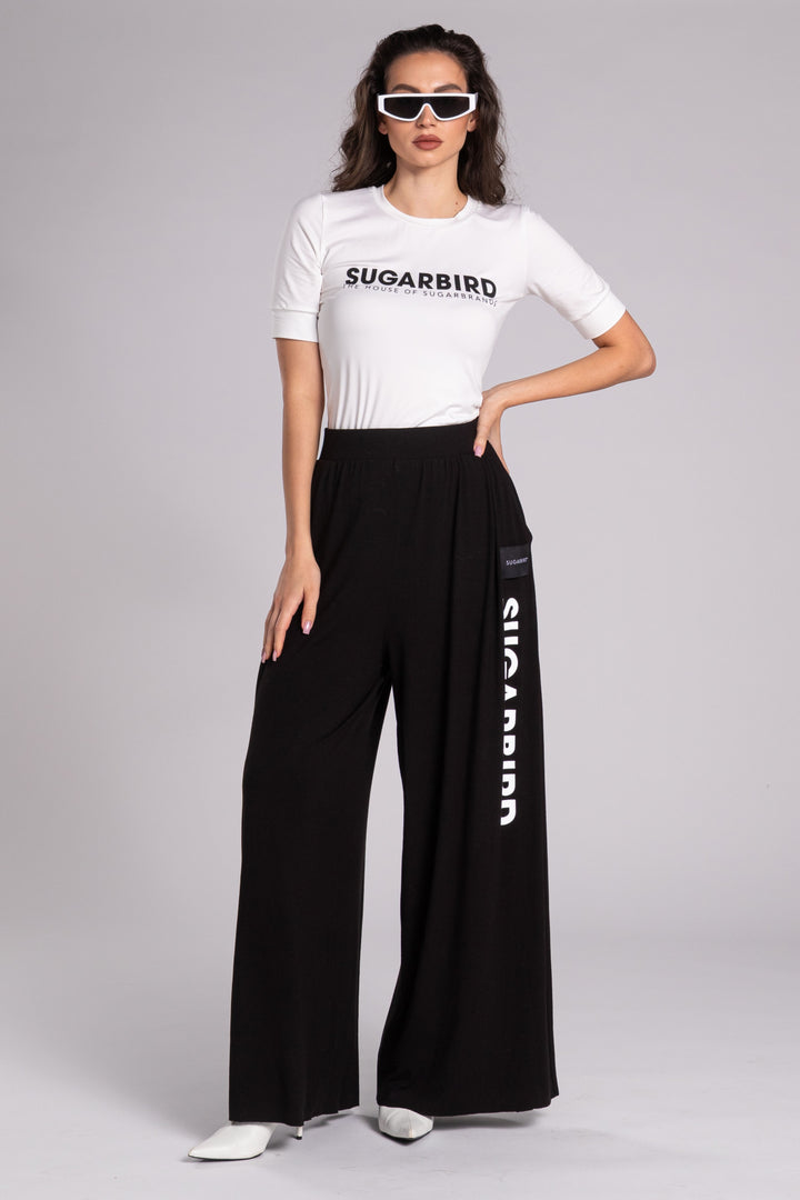 Maxi hosszúságú, széles, gumizott derekú, bő szárú nadrág. Eleje derekán hajtásokkal díszített, hátán pedig szűkítővel formázott. Oldalaiban svédzsebek, bal elején a zseb mellé nagy SUGARBIRD címkét varrtunk.